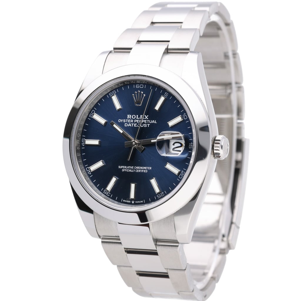 A Rolex Datejust 41 reference 126300 in stainless steel, featuring a 41mm Oyster case with a smooth bezel and a refined, contemporary profile. The blue sunburst dial offers a rich, shifting tone under light, complemented by applied baton hour markers and polished hands with Chromalight display. The classic Datejust layout is enhanced by the Cyclops lens over the date, maintaining strong legibility and timeless appeal.