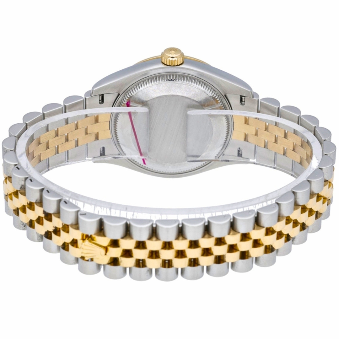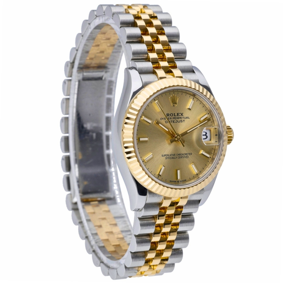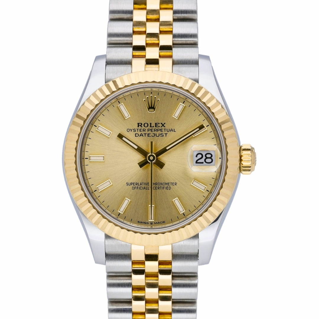 A bi-metal Rolex Datejust reference 278273 features a 31mm stainless steel case paired with an 18ct yellow gold fluted bezel, delivering a classic and instantly recognisable Rolex aesthetic. The champagne dial is clean and well-balanced, fitted with applied baton hour markers and framed by the iconic Cyclops date window at 3 o’clock. The yellow Rolesor bracelet completes the look with a refined yet versatile presence.