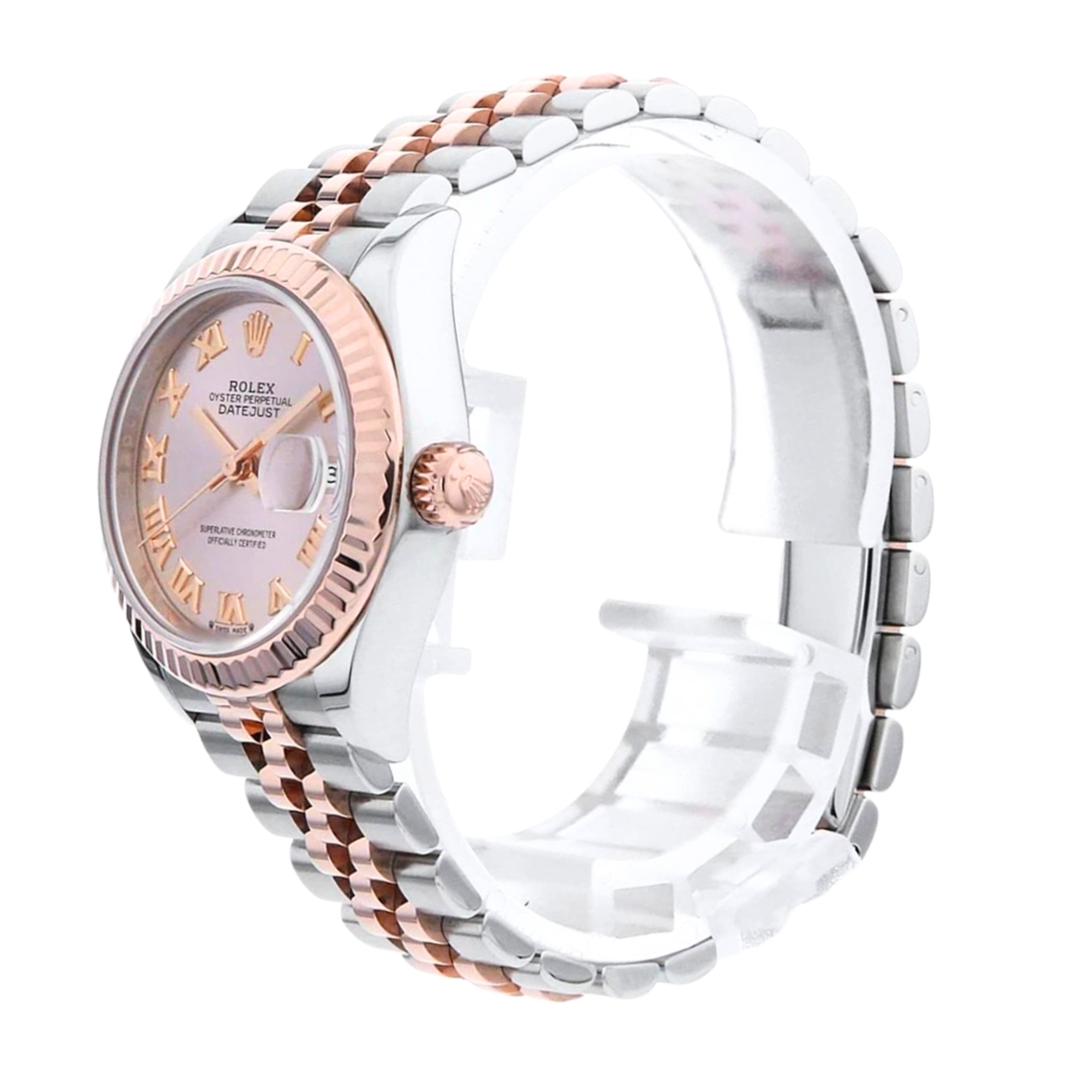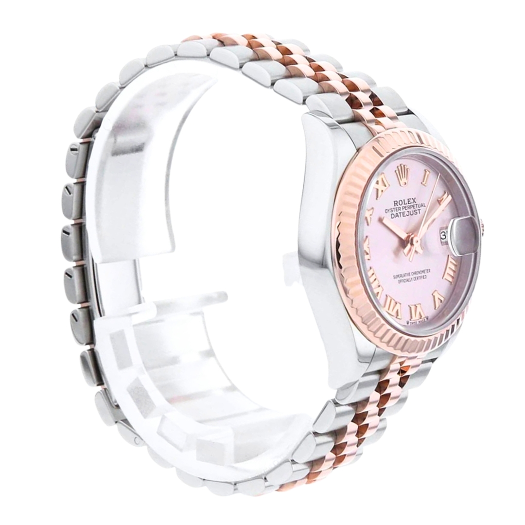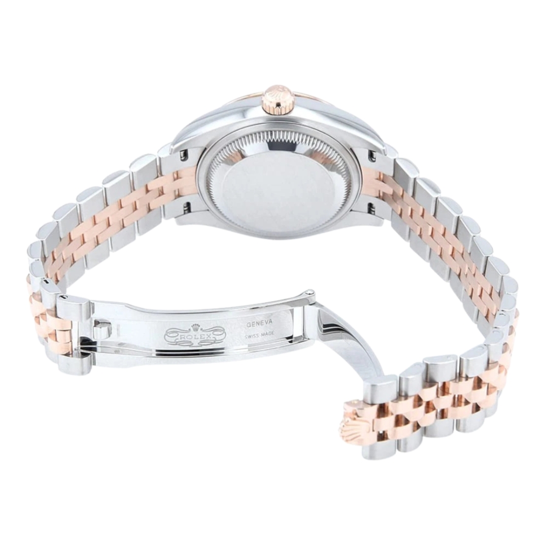 A Rolex Datejust 28 reference 279171 in stainless steel and 18ct Everose gold, featuring a refined 28mm Oyster case complemented by a fluted bezel in solid rose gold. The sundust dial presents a soft, warm tone that pairs seamlessly with the Everose accents, while applied Roman numeral hour markers add a classic elegance, maintaining excellent balance and legibility.