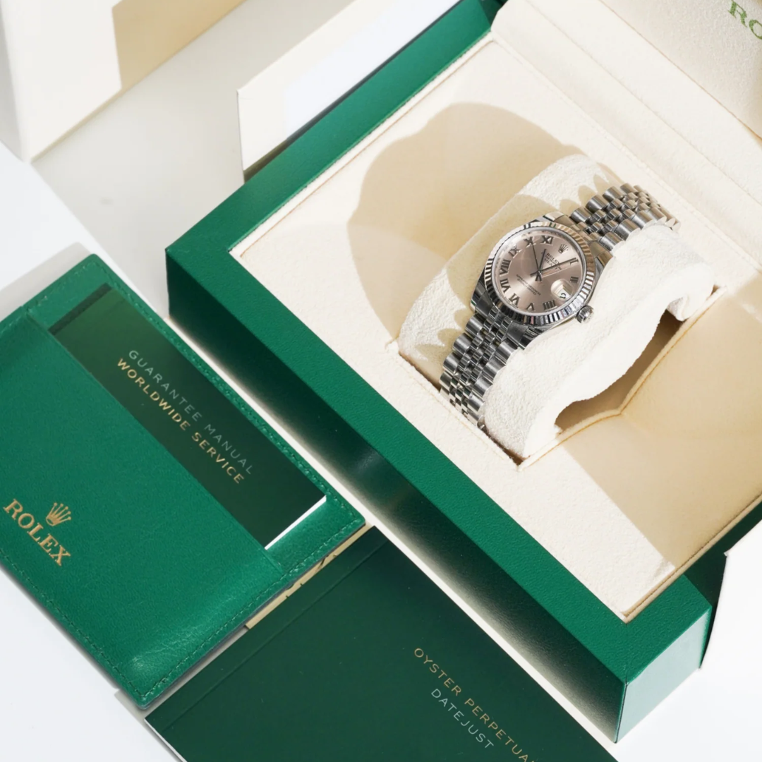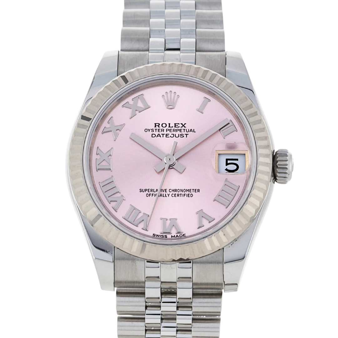 A Rolex Datejust 31 reference 178274 in stainless steel, enhanced by an 18ct white gold fluted bezel and presented in a refined 31mm Oyster case. The soft pink dial offers a distinctive and elegant aesthetic, complemented by applied Roman numeral hour markers that add a classic touch while maintaining excellent legibility and a balanced presence on the wrist.