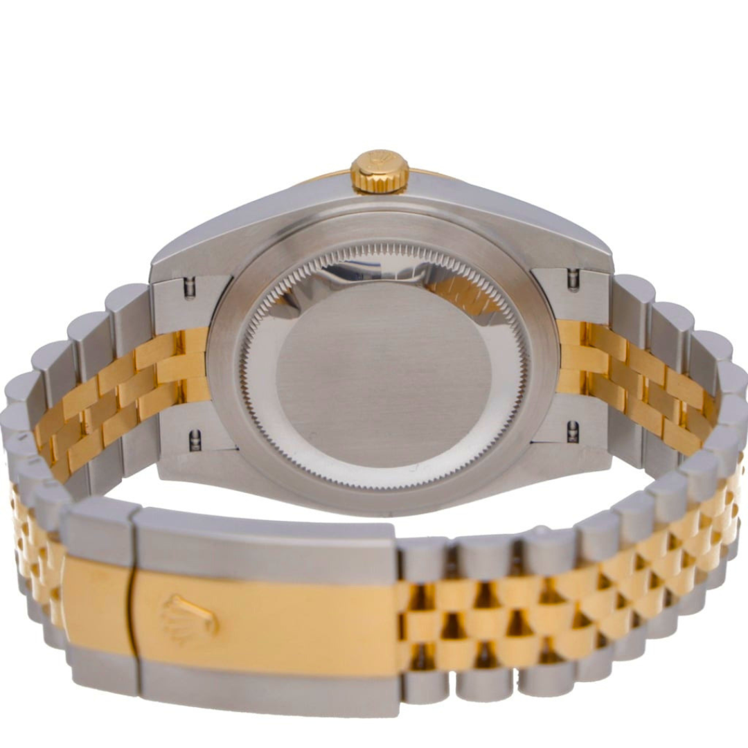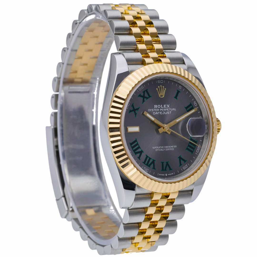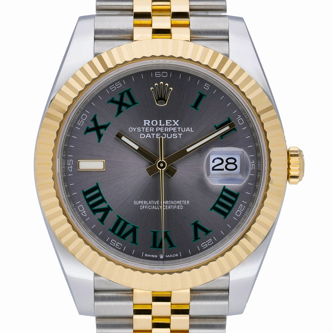 A Bi-Metal Rolex Datejust 41 reference 126333 in stainless steel and 18ct yellow gold, featuring the signature fluted bezel and presented on a Jubilee bracelet, offering a timeless blend of classic design and contemporary refinement. The slate dial is enhanced by green Roman numerals, creating a distinctive and highly recognisable aesthetic that adds depth and character while maintaining excellent legibility.