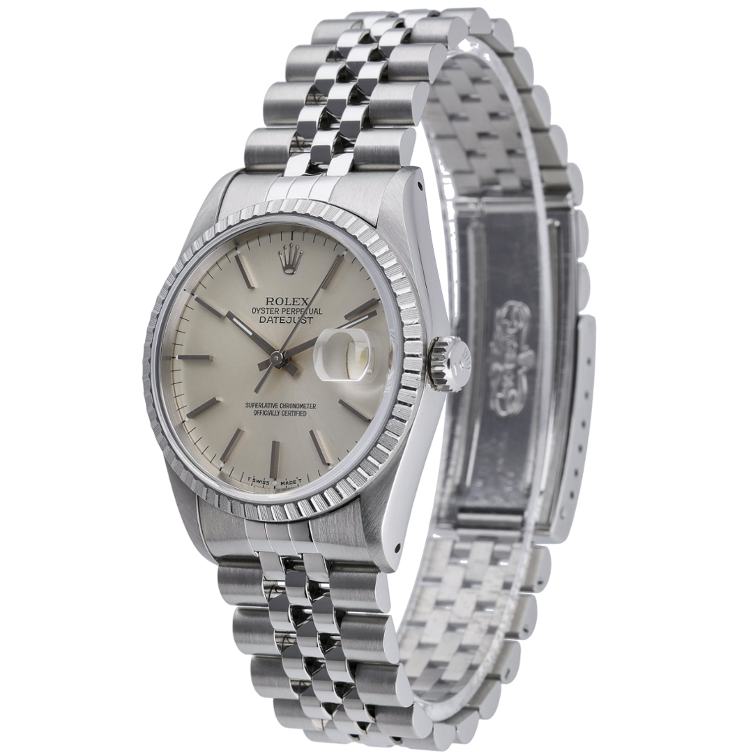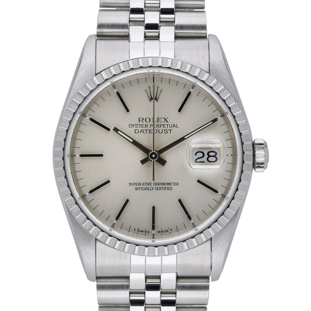 A Rolex Datejust Watch, Stainless Steel with an Engine Turned Bezel on a Silver Dial