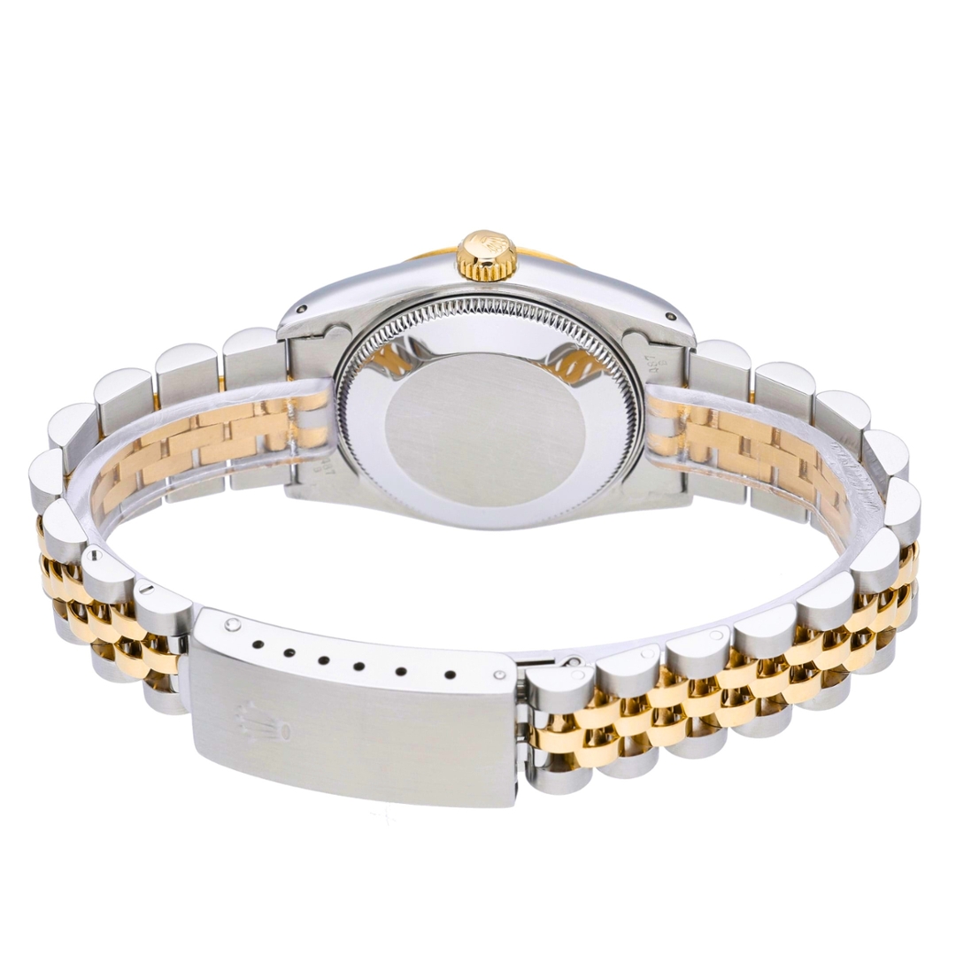 This bi-metal Rolex Datejust reference 68273 features a 31mm Oyster case in stainless steel, paired with an 18ct yellow-gold fluted bezel and a matching Jubilee bracelet. The champagne Jubilee dial displays the repeating Rolex motif and features original Rolex diamond numerals, complemented by gold hands and an applied coronet. An acrylic crystal with cyclops date magnification completes the classic aesthetic associated with early-1990s Datejust models.