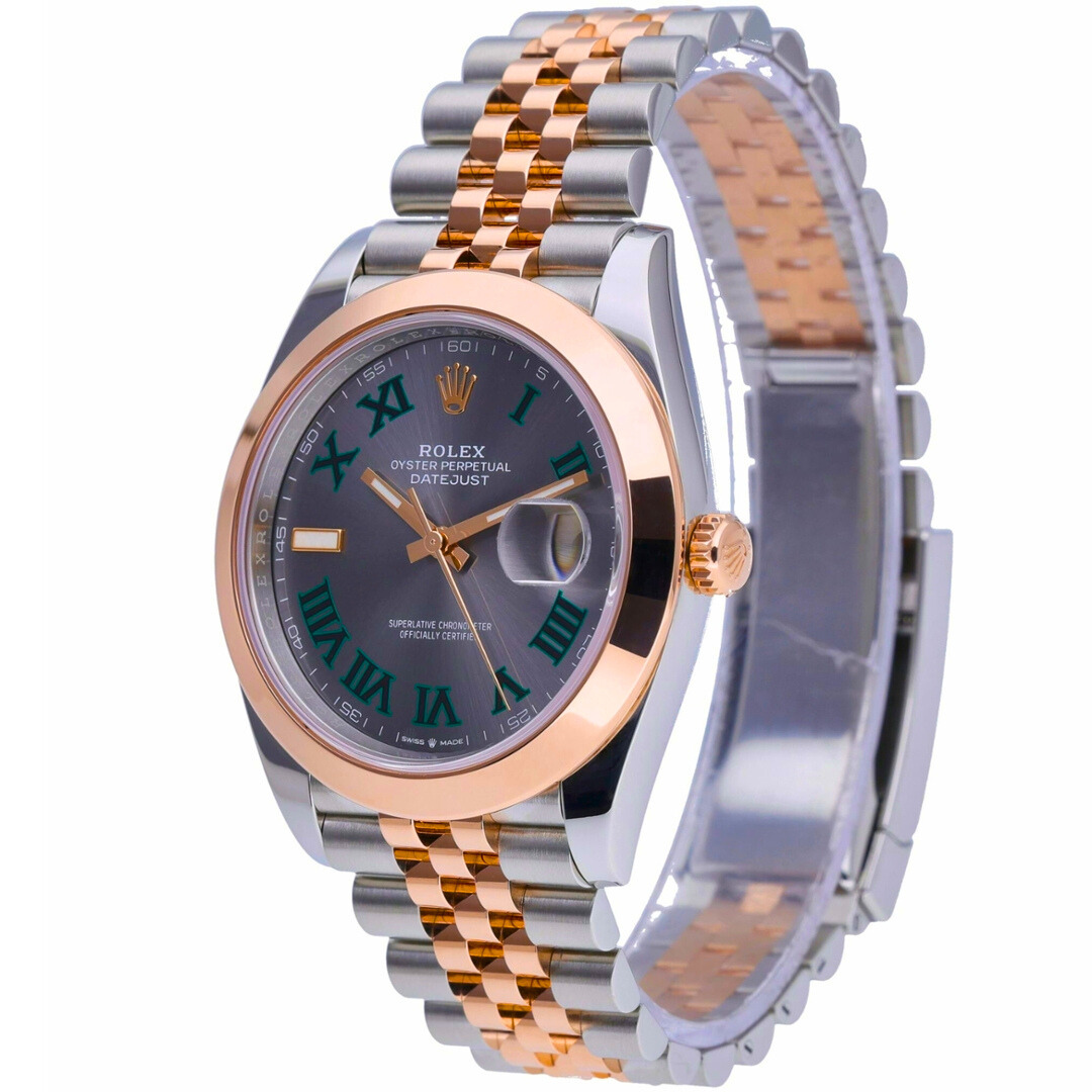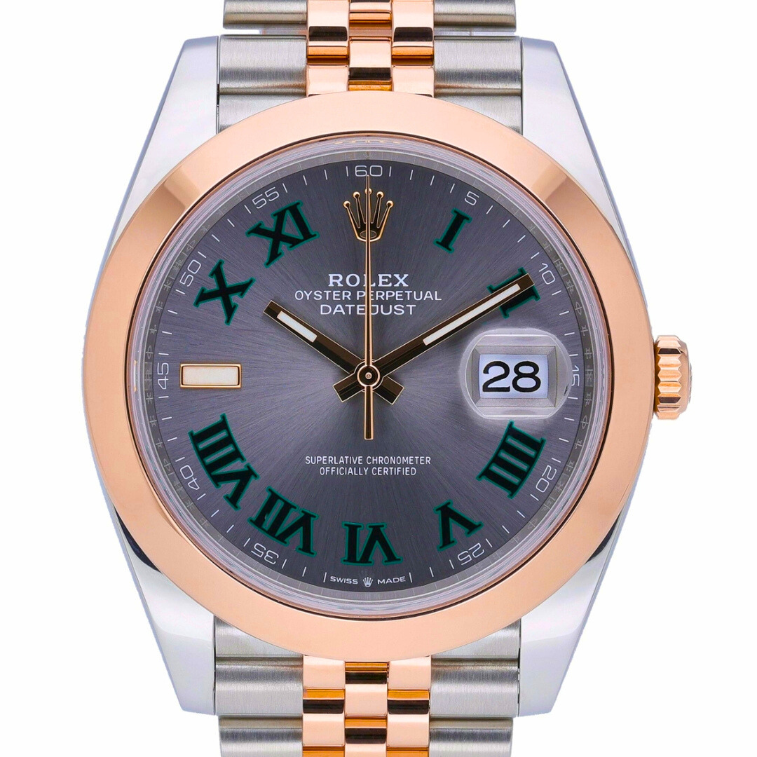 A Bi-Metal Rolex Datejust 41 Watch crafted from stainless steel and 18ct Everose gold, paired with the distinctive slate dial featuring green Roman numerals. The 41mm Oyster case is fitted with a smooth Everose gold bezel that adds a refined warmth to the classic Datejust design. The slate sunburst dial creates subtle depth across the surface, while the applied Roman numerals and luminous baton markers provide a striking, contemporary interpretation of the traditional Datejust layout.