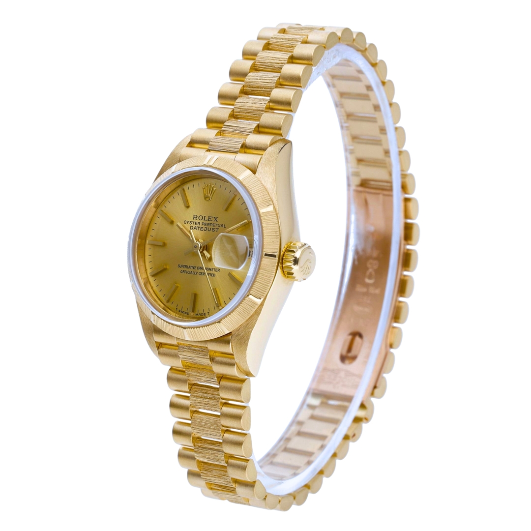 A Rolex Datejust, model 69278, presented in full 18ct yellow gold, showcasing a distinctive and highly desirable bark-finished design throughout. The 26mm case is complemented by a matching bark-finished bezel and Presidential bracelet, creating a rich texture that sets this piece apart from standard configurations. The champagne dial enhances the warm tones of the gold, finished with applied hour markers and a date display at 3 o’clock, magnified by the Cyclops lens for everyday practicality.