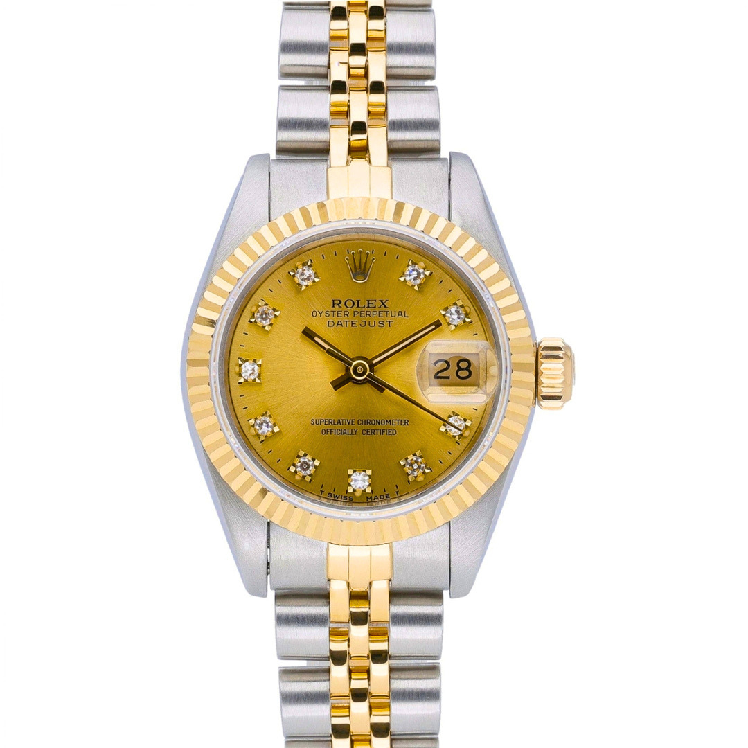 A Rolex Datejust 26 reference 69173 in stainless steel and 18ct yellow gold, featuring an 18ct yellow gold fluted bezel and a rich champagne dial set with original Rolex diamond hour markers. The warm tones of the dial and gold detailing create a classic and instantly recognisable aesthetic, perfectly suited to the refined proportions of the 26mm case.