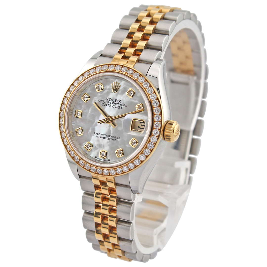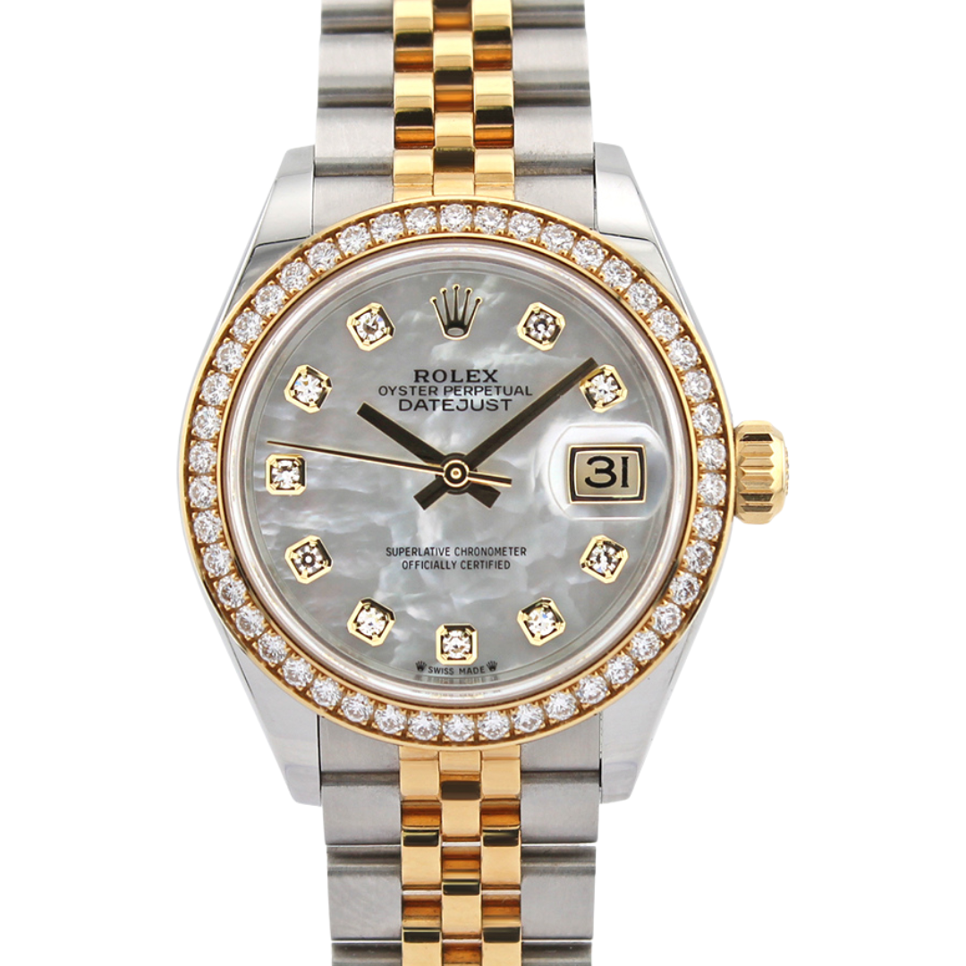 A Rolex Datejust 28 reference 279383RBR in stainless steel and 18ct yellow gold, featuring the factory original yellow gold diamond-set bezel. The white mother-of-pearl dial displays a soft iridescence, complemented by diamond hour markers set within yellow gold surrounds, enhancing both depth and elegance. The classic Jubilee bracelet in bi-metal construction completes the look, offering a refined, versatile presence that suits the 28mm case size.