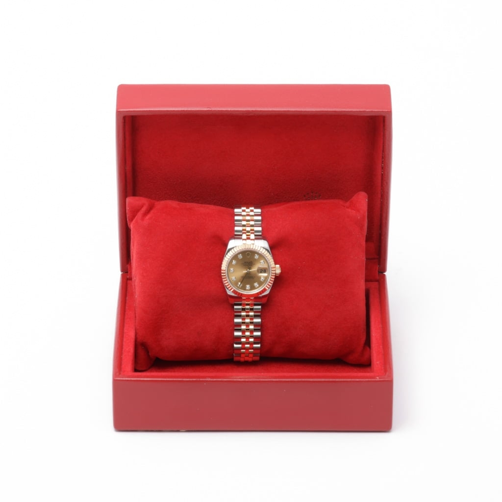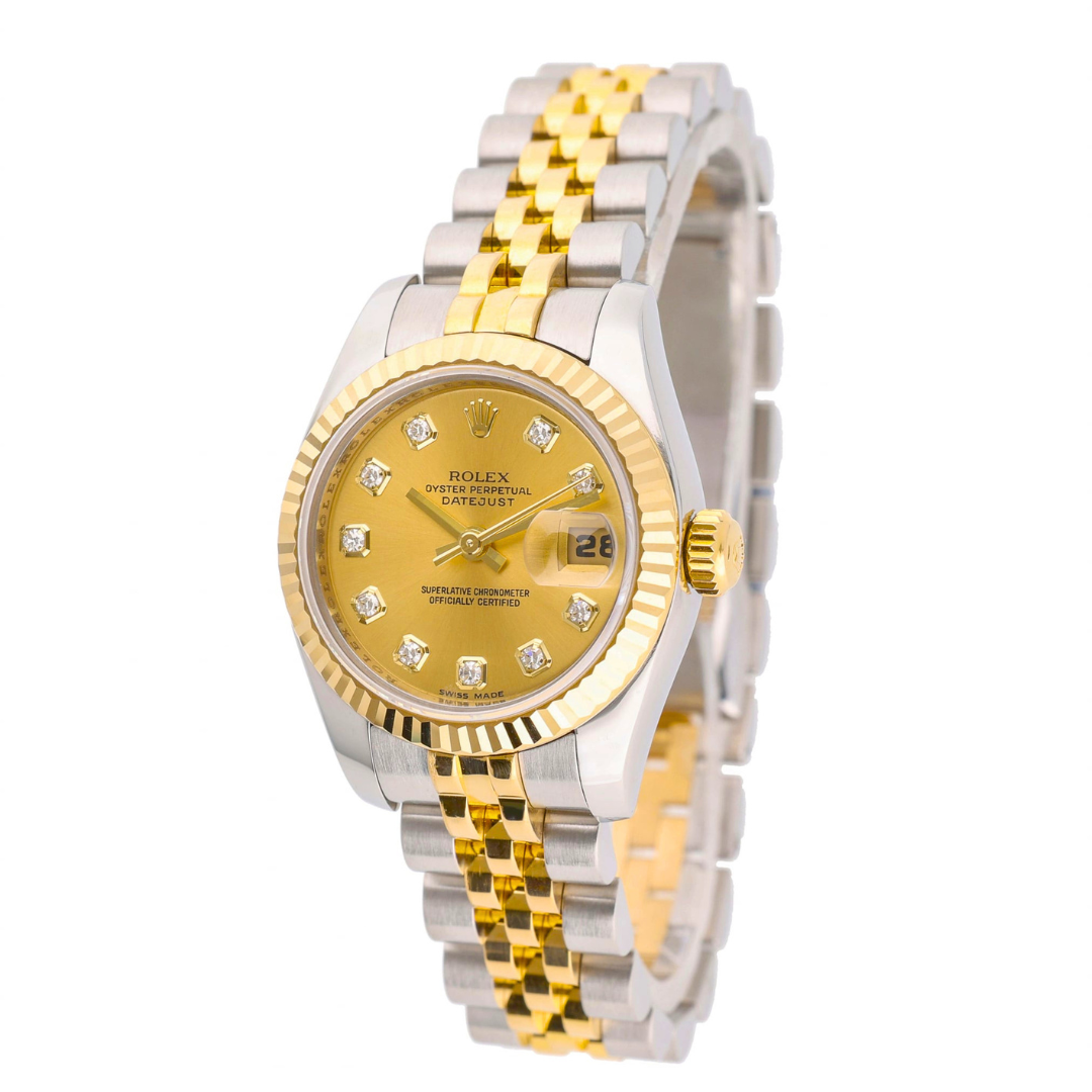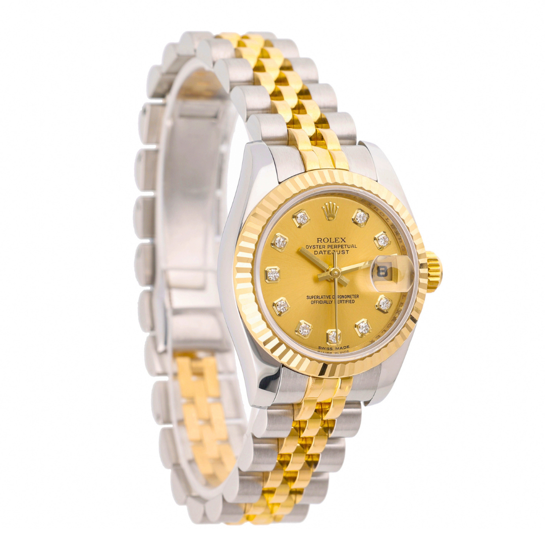 A Rolex Datejust reference 179173 in Bi-Metal stainless steel and 18ct Yellow Gold, featuring a fluted 18ct Yellow Gold bezel and a champagne dial with original Rolex diamond hour markers. The dial features applied gold surrounds, gold baton hands, and a date aperture at 3 o’clock with a Cyclops lens. The 26mm Oyster case presents a refined, compact profile, while the champagne dial maintains a classic, highly recognisable Datejust aesthetic.