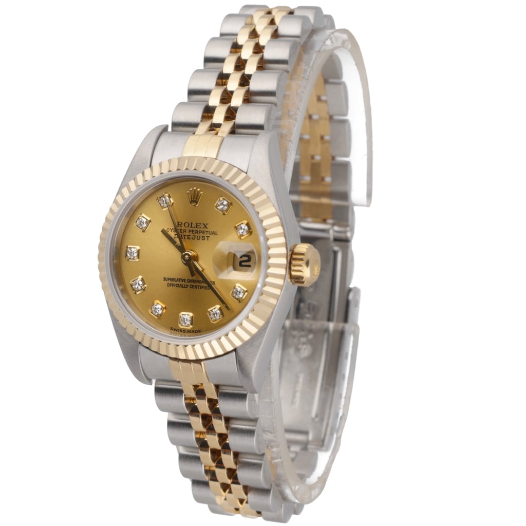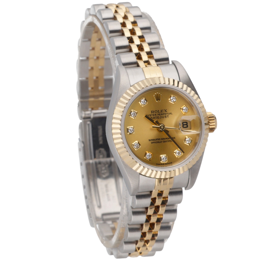 A Rolex Datejust reference 79173 in Bi-Metal stainless steel and 18ct Yellow Gold, featuring a fluted 18ct Yellow Gold bezel and a champagne dial with original Rolex diamond hour markers. The dial features applied gold surrounds, gold baton hands, and a date aperture at 3 o’clock with a Cyclops lens. The 26mm Oyster case maintains classic proportions, while the champagne dial delivers a traditional, highly recognisable Datejust configuration.