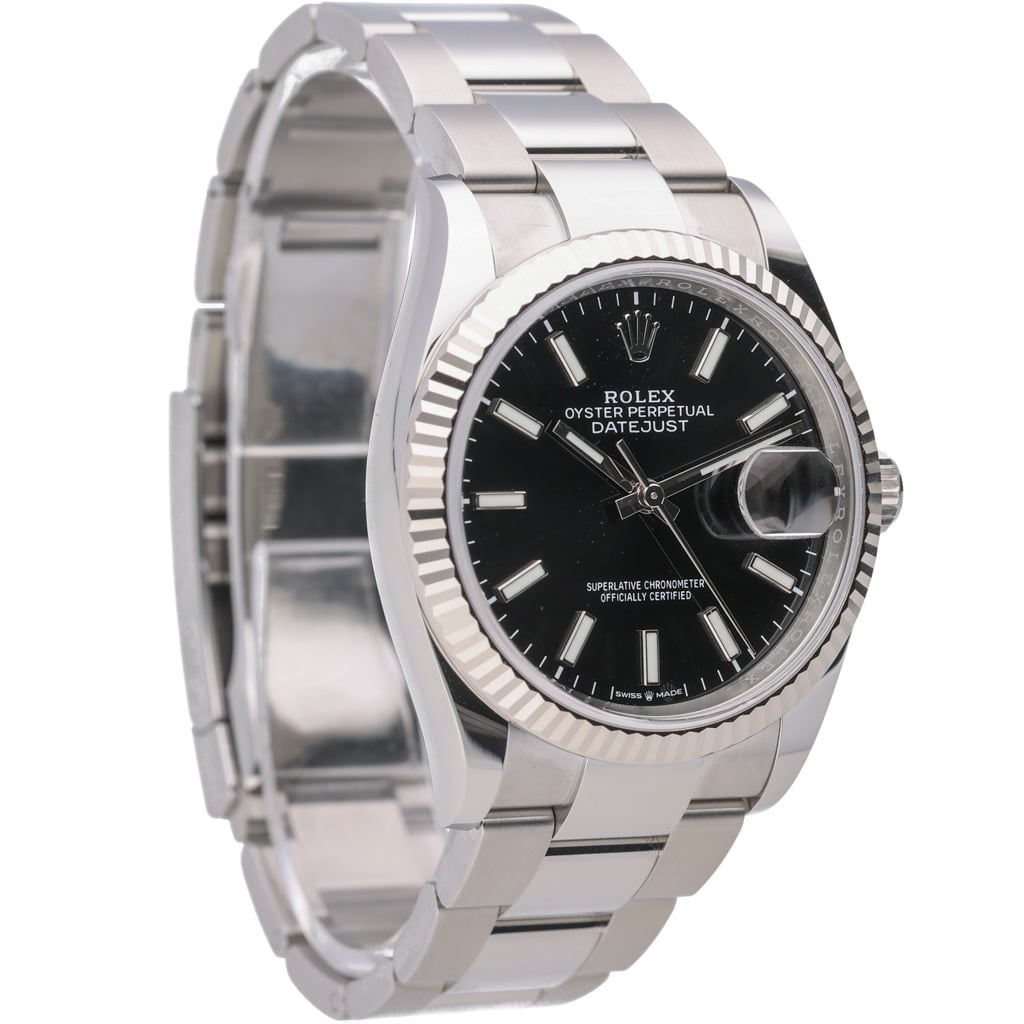 A Rolex Datejust 36 reference 126234 in stainless steel, featuring a sleek black dial with applied baton hour markers and the signature Cyclops date display. The 18ct white gold fluted bezel adds contrast and refinement, elevating the otherwise understated monochrome aesthetic, while the Oyster bracelet gives the watch a more contemporary and robust feel on the wrist.