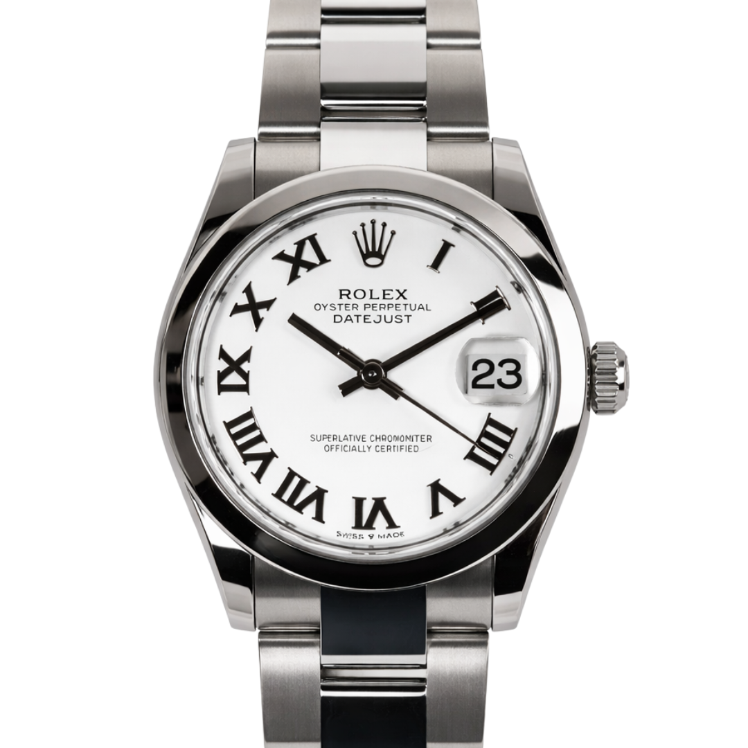 A Rolex Datejust 31 reference 278240 in stainless steel, featuring a crisp white dial with applied black Roman numerals and the signature Cyclops date display. The clean dial contrast gives this piece a timeless, elegant aesthetic, while the smooth bezel and Oyster bracelet provide a modern, understated finish suitable for everyday wear.