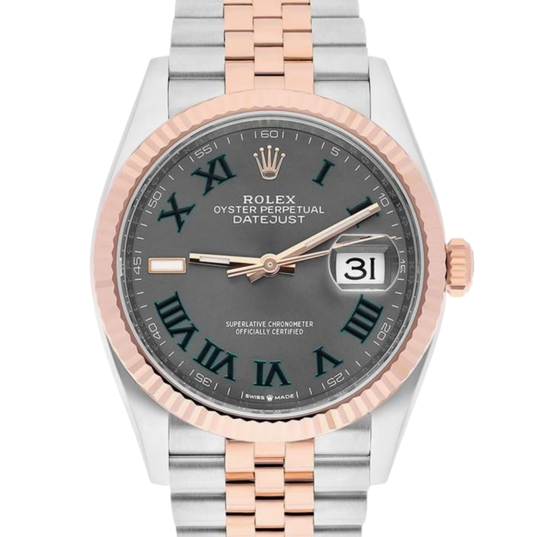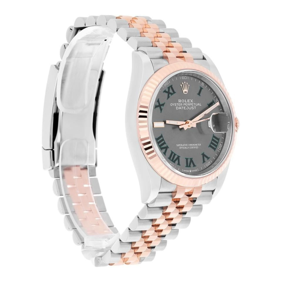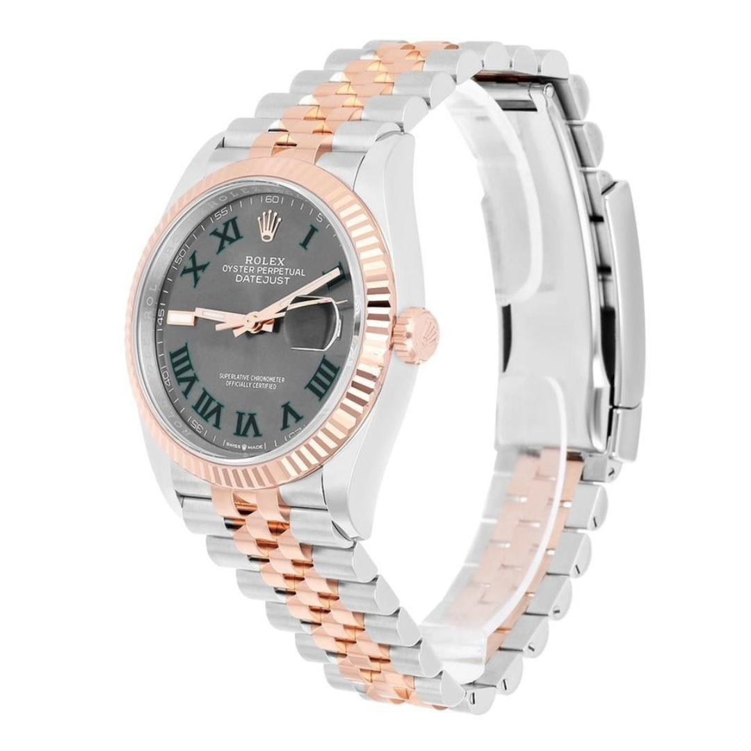 A Rolex Datejust 36 reference 126231 in stainless steel and 18ct Everose gold, featuring a slate dial with green Roman numerals and the signature Cyclops date display. The warm tone of the Everose gold fluted bezel pairs beautifully with the darker dial, while the Jubilee bracelet enhances the overall elegance and classic Datejust aesthetic.