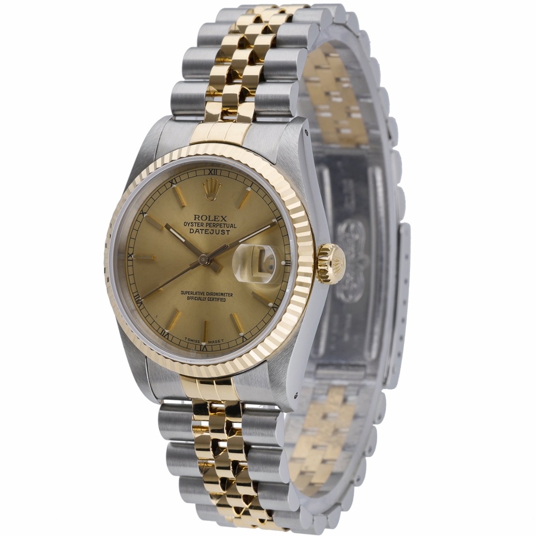 A Rolex Datejust 16233 in its most recognisable and enduring configuration, combining stainless steel and 18ct yellow gold with the signature fluted bezel and classic champagne dial. The 36mm case delivers a balanced and versatile wrist presence, while the warm tones of the dial and gold accents create a refined, unmistakably Rolex aesthetic that has remained in demand for decades.