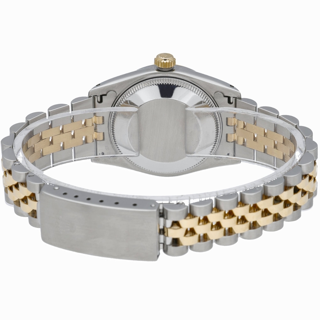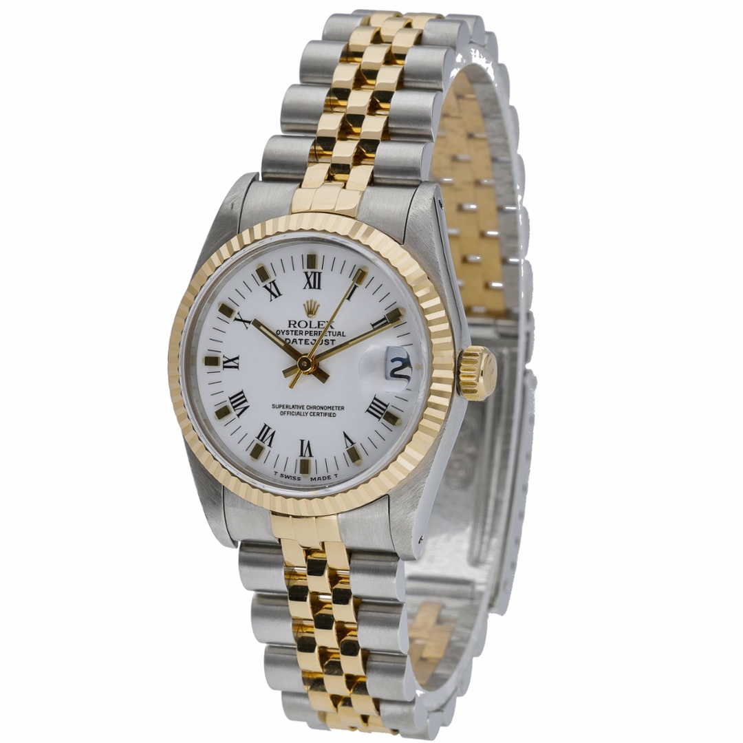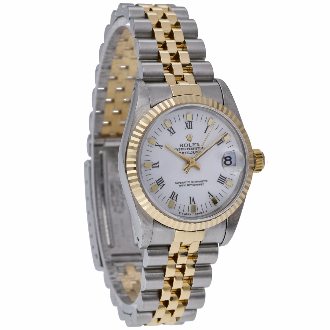 A Rolex Datejust 68273 in stainless steel and 18ct yellow gold, featuring the iconic fluted yellow gold bezel and a crisp white dial adorned with classic Roman numerals. The 31mm case size offers a refined and versatile presence on the wrist, perfectly balancing traditional proportions with everyday wearability. The contrast between the white dial, black Roman markers, and warm gold accents delivers a timeless aesthetic that remains a staple within the Datejust collection.