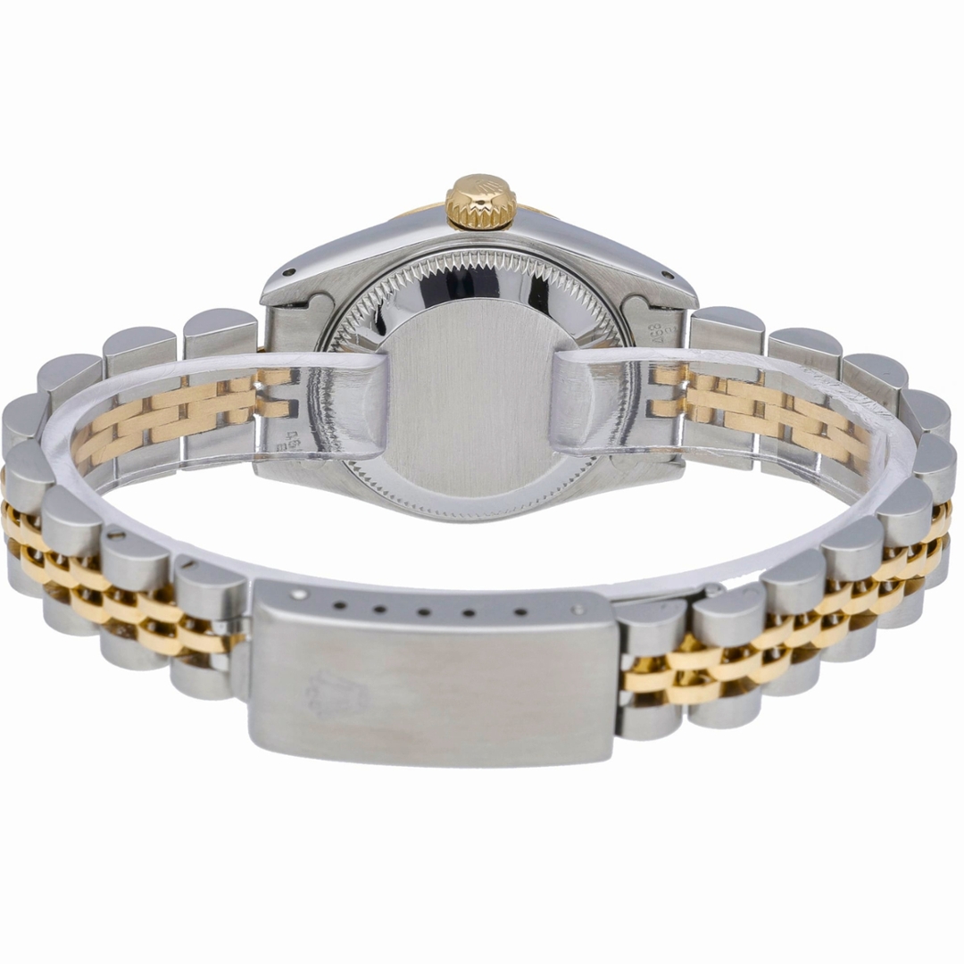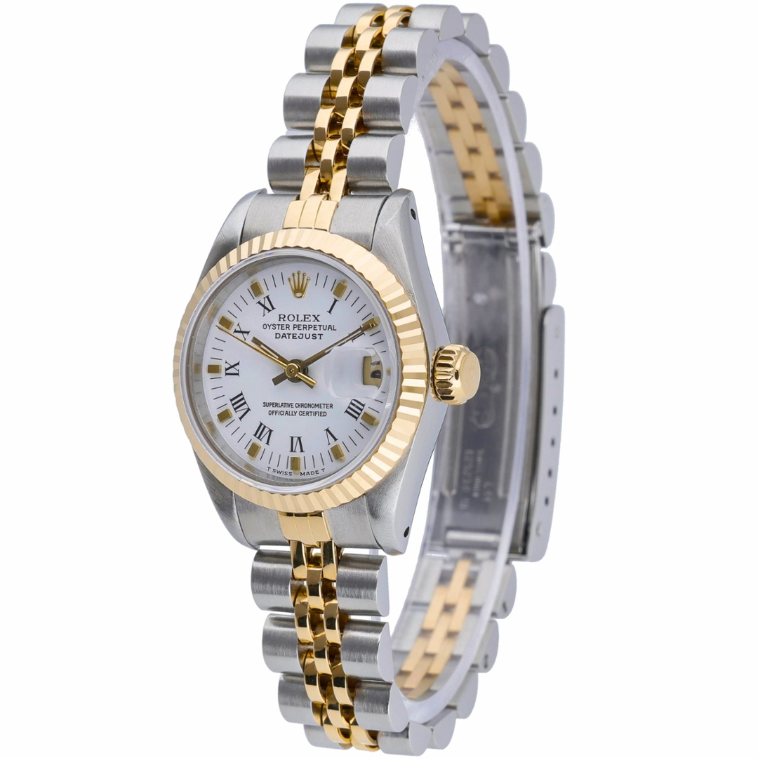 A Bi-Metal Rolex Datejust combining stainless steel and 18ct yellow gold, presented in the classic 26mm case that defines this enduring model. The fluted yellow gold bezel adds a distinctive Rolex signature, while the Jubilee bracelet enhances both comfort and visual balance. The white dial is fitted with Roman numeral hour markers, offering a traditional aesthetic that complements the warm tones of the gold accents.
