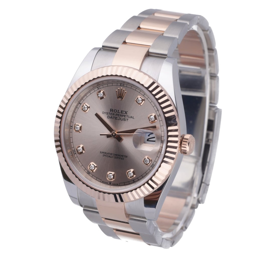 A Rolex Datejust 41 126331 Watch, crafted in stainless steel and 18ct Everose gold, featuring an 18ct Everose gold fluted bezel and the elegant Sundust dial set with original Rolex diamond hour markers. This refined two-tone configuration offers a warm, understated look, with the sunburst dial finish enhancing depth and contrast against the diamond-set indices.