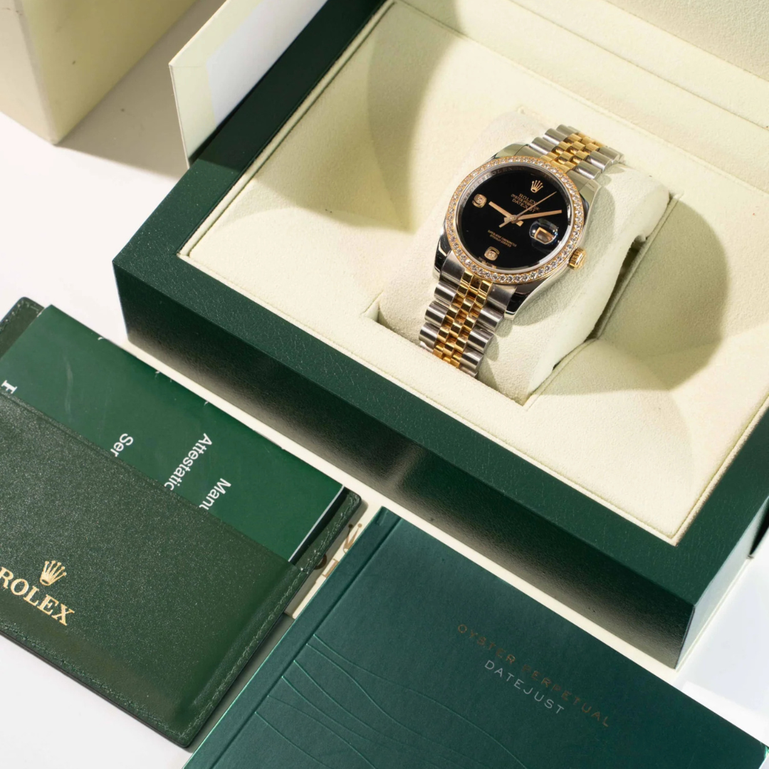 From an investment perspective, factory diamond-set Rolex models have shown consistent strength, particularly when paired with desirable dial configurations such as black with gold accents. The combination of precious metal, factory-set diamonds, and full-set presentation supports ongoing demand, with well-preserved examples continuing to perform strongly in the secondary market.