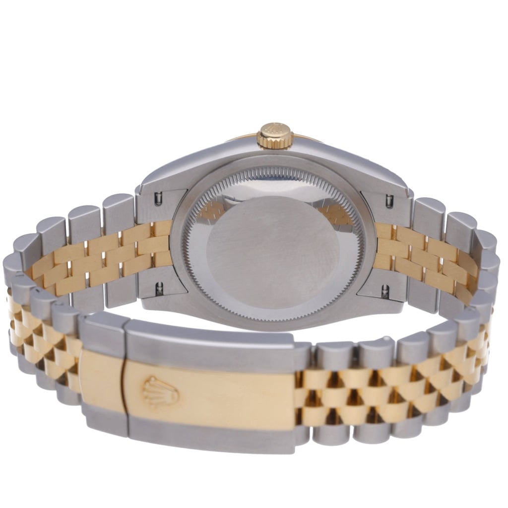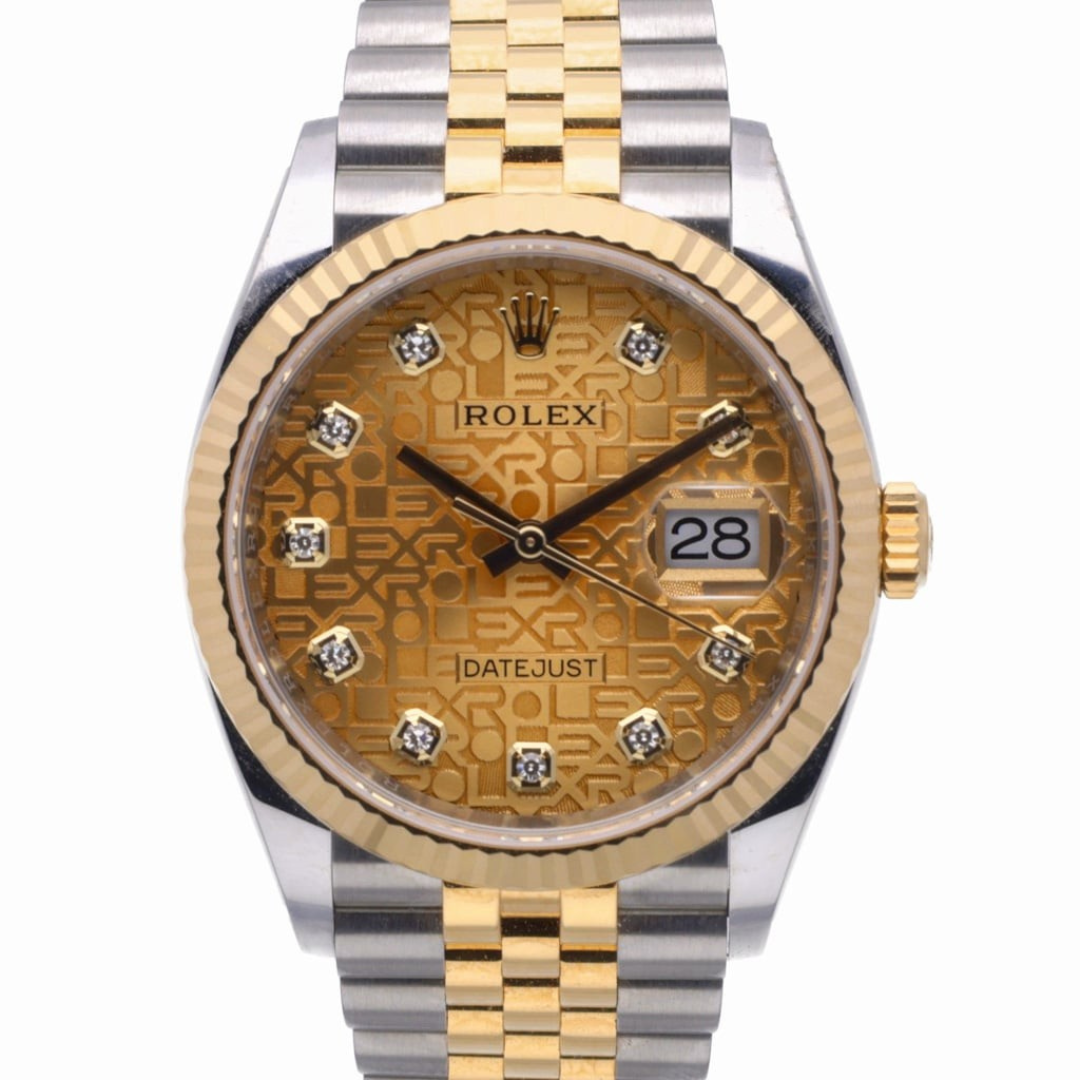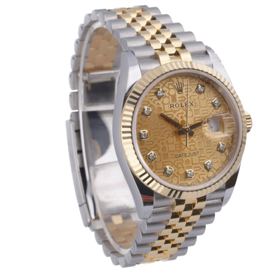A Rolex Datejust 126233 in stainless steel and 18ct yellow gold, presented with the distinctive champagne Jubilee dial featuring the iconic repeating Rolex motif. The 36mm Oyster case is paired with a fluted yellow gold bezel, delivering the unmistakable aesthetic that has defined the Datejust for generations. The combination of bi-metal construction and this highly sought-after dial creates a standout configuration, further elevated by original factory diamond hour markers that add a refined sense of luxury without overpowering the design.