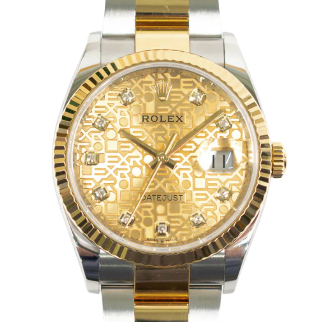 A Rolex Datejust 126233 in stainless steel and 18ct yellow gold, featuring the striking champagne Jubilee dial adorned with the iconic repeating Rolex motif. This highly distinctive dial is complemented by original factory diamond hour markers, adding a refined brilliance that enhances its visual depth without compromising the classic Datejust aesthetic. The 36mm Oyster case is paired with a fluted yellow gold bezel, creating a timeless and recognisable profile that has defined the model for decades.