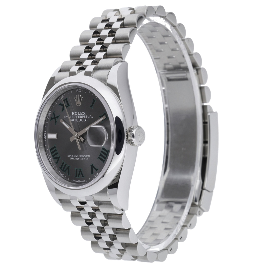 A Rolex Datejust 126200, a sleek, modern iteration of the classic Datejust, is a stunning timepiece that combines precision, style, and versatility. This model is crafted from stainless steel, offering robustness and a refined aesthetic. The 36mm case provides a more significant wrist presence while maintaining a timeless, elegant profile. The slate dial is striking, offering a dark, sophisticated hue that contrasts beautifully with the polished silver hour markers and hands. This contemporary colour choice gives the watch a unique, understated look that is versatile for any occasion.