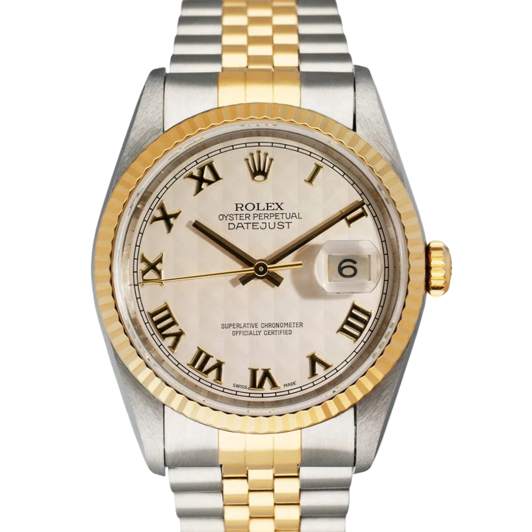 A Rolex Datejust 16233, crafted in stainless steel and 18ct yellow gold, featuring a white pyramid dial with applied yellow gold Roman numerals and a matching fluted bezel. The textured dial adds depth and character to this classic configuration, giving it a more distinctive presence than standard finishes while retaining the timeless Datejust aesthetic.