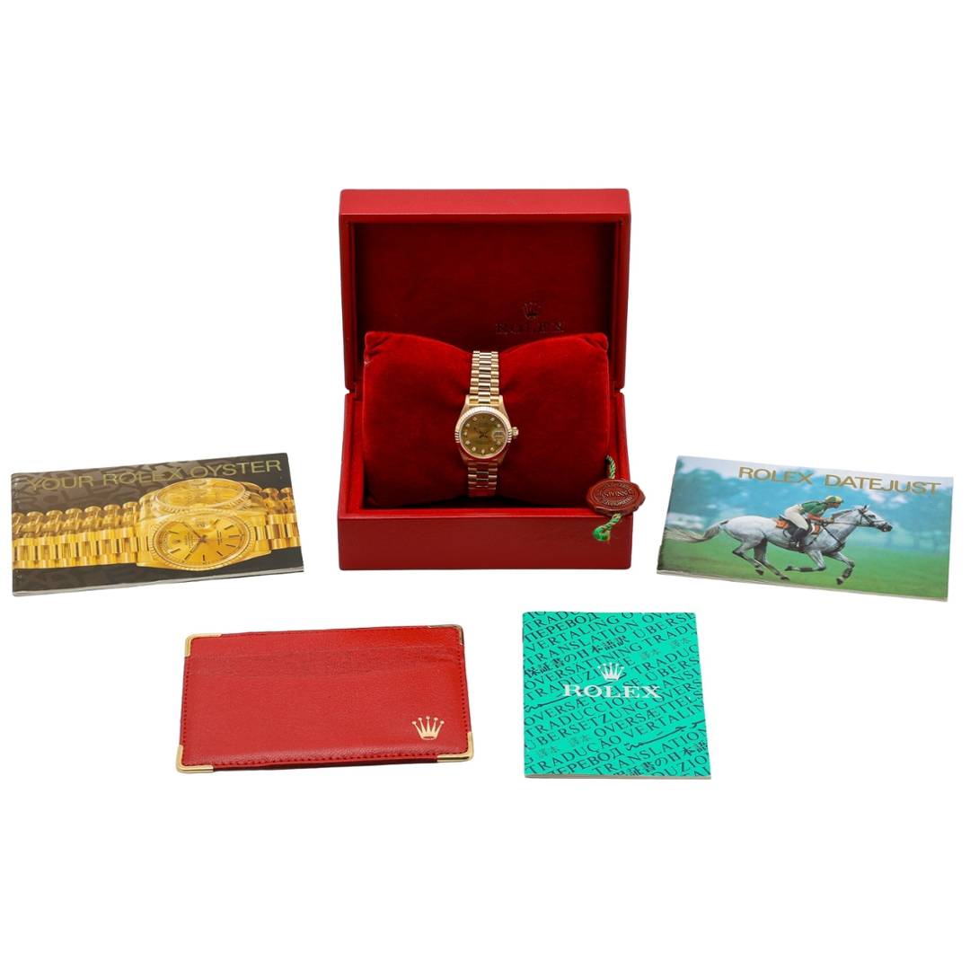This Rolex Datejust reference 69178 is a classic full 18ct yellow gold example, paired with a rich champagne dial set with original factory Rolex diamond hour numerals. The fluted yellow gold bezel and President bracelet give the watch a distinctly luxurious presence, while the compact 26mm case maintains elegant proportions true to the era.