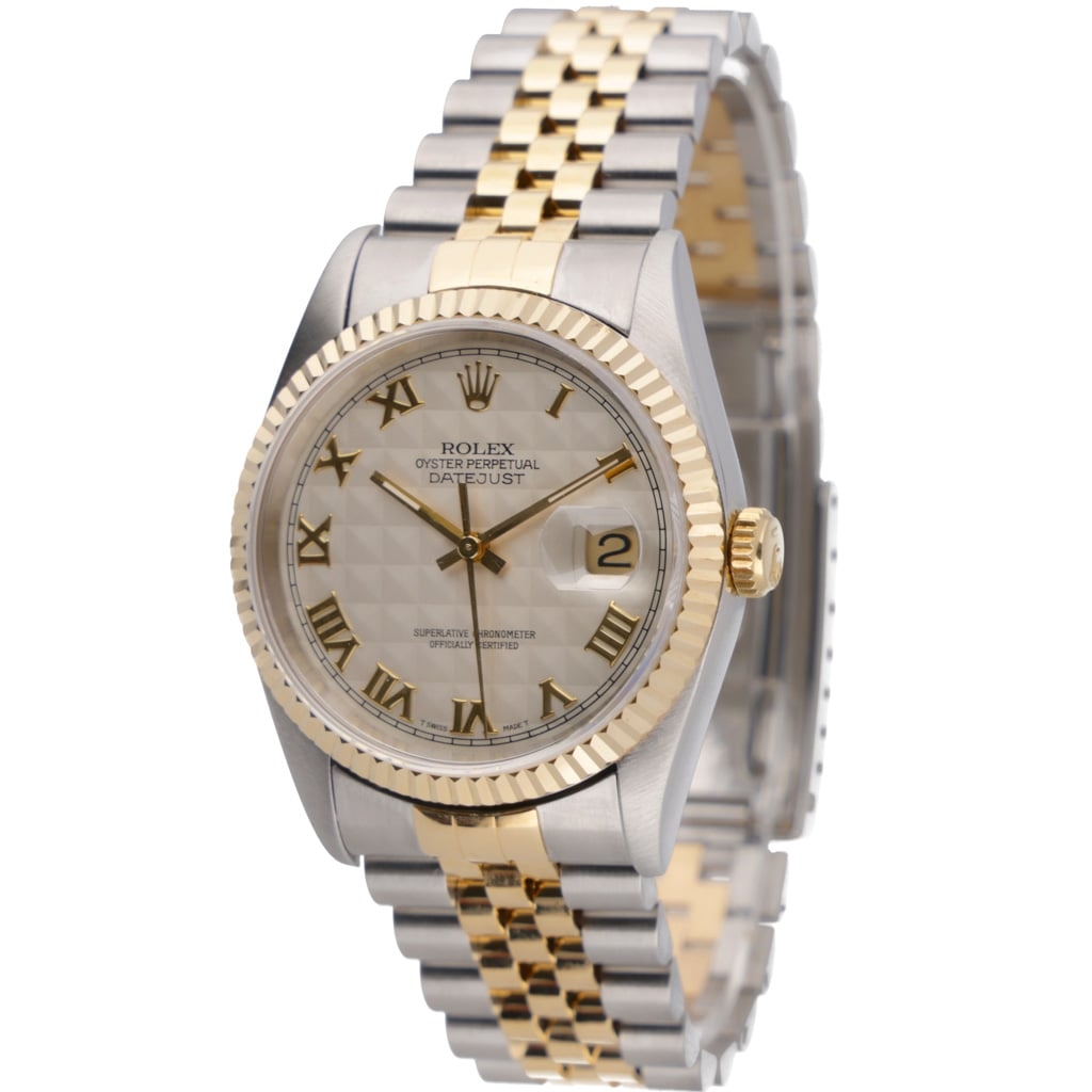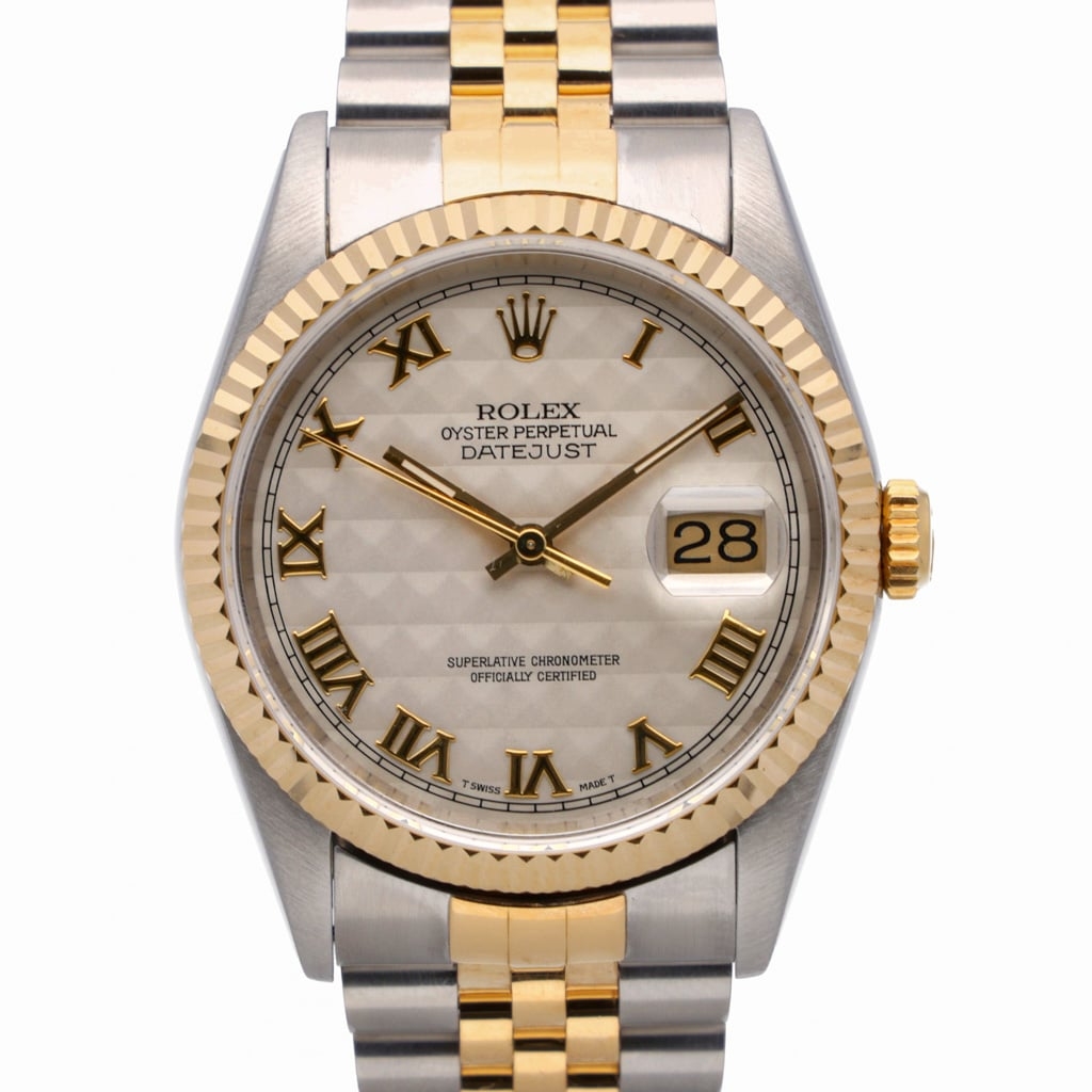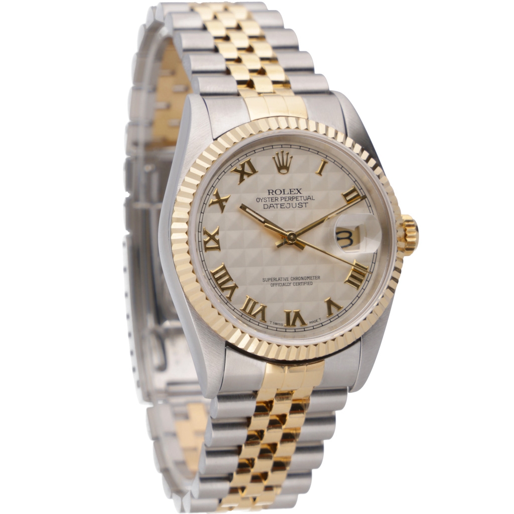 A Rolex Datejust 36 reference 16233 in stainless steel and 18ct yellow gold, featuring the classic fluted bezel and a distinctive cream pyramid dial with applied Roman numerals. This textured dial configuration adds depth and character, offering a less common variation within the traditional Datejust range.