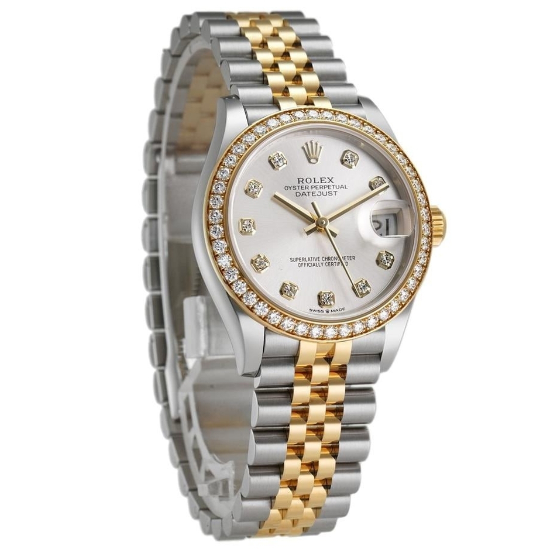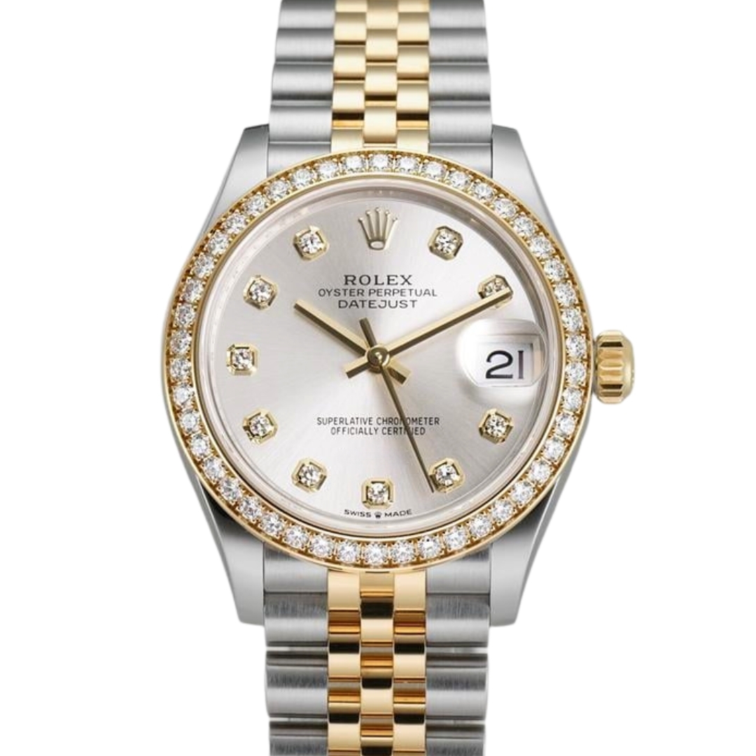 A Rolex Datejust 31, crafted in stainless steel and 18ct yellow gold, is elevated by its original factory-set diamond bezel and matching Rolex diamond hour markers on a refined silver dial. This configuration sits at the top end of the Datejust range, offering a perfect balance of everyday wearability and high-end luxury appeal.