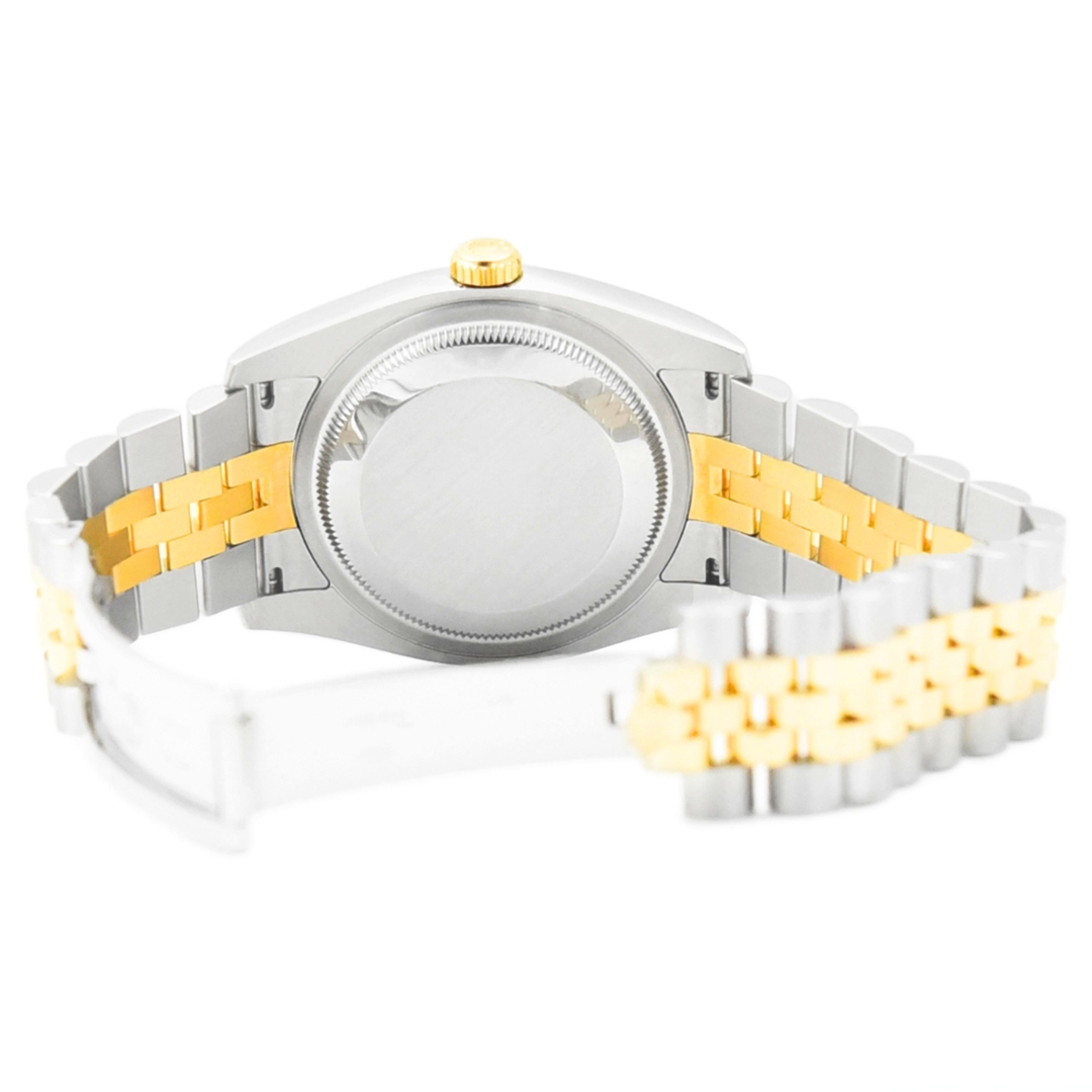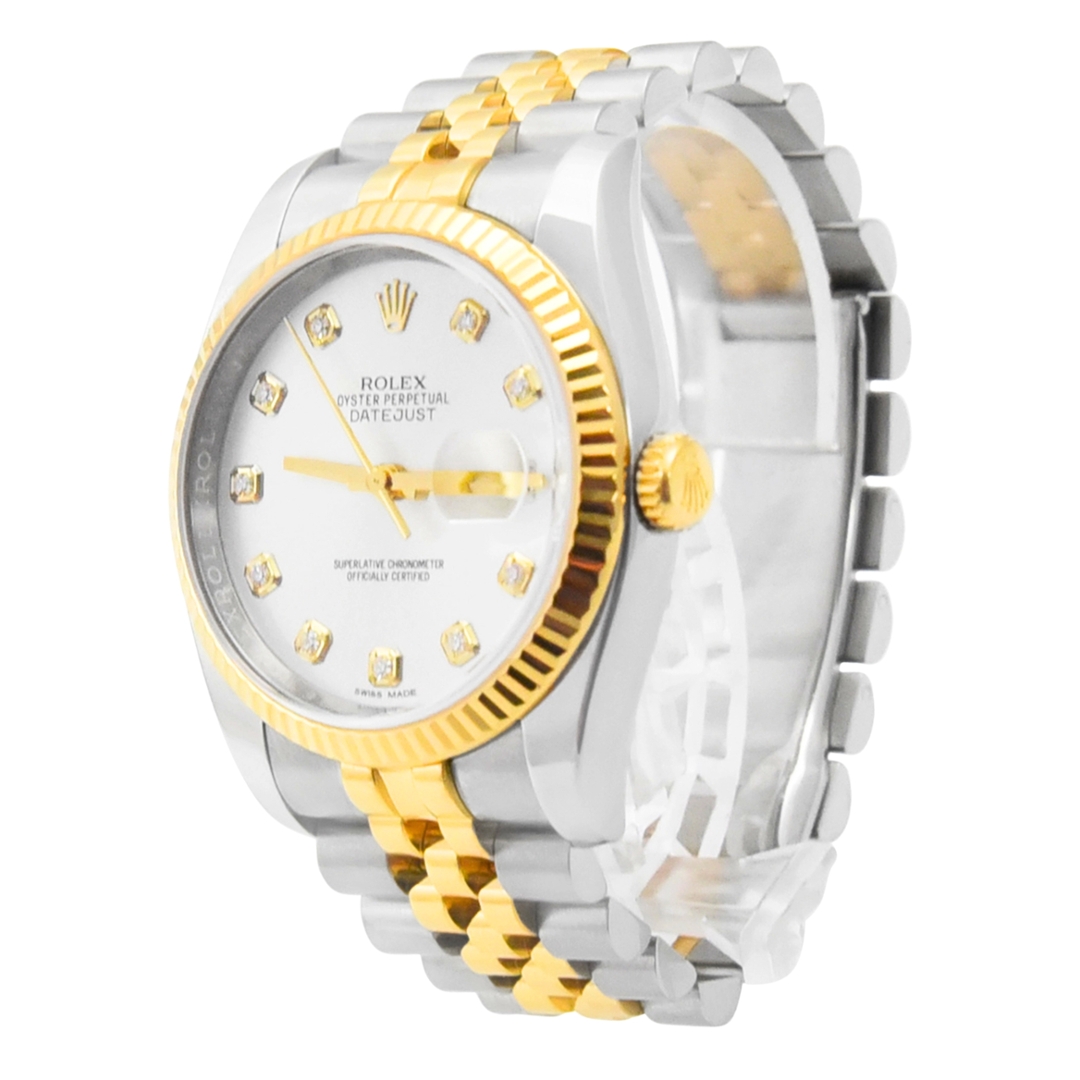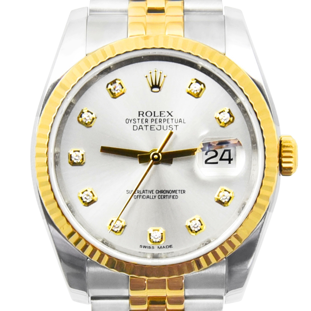 A Rolex Datejust Watch, model 116233, presented in immaculate condition. Crafted from stainless steel and 18ct yellow gold, this 2012 example features the iconic yellow gold fluted bezel and a silver sunburst dial set with original Rolex diamond hour numerals. The 36mm Oyster case offers the classic Datejust proportions, paired with a bi-metal Jubilee bracelet and powered by the Rolex Calibre 3135 automatic movement.