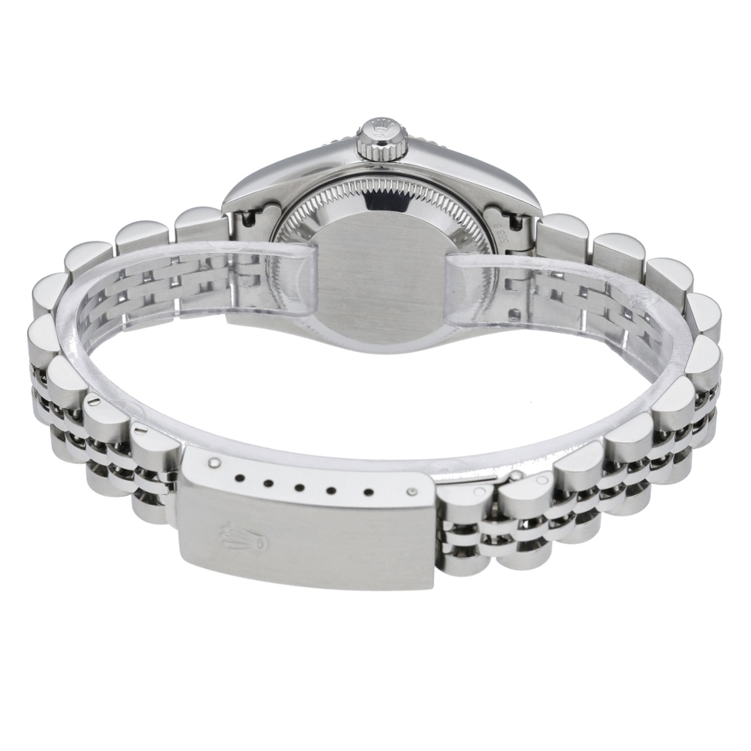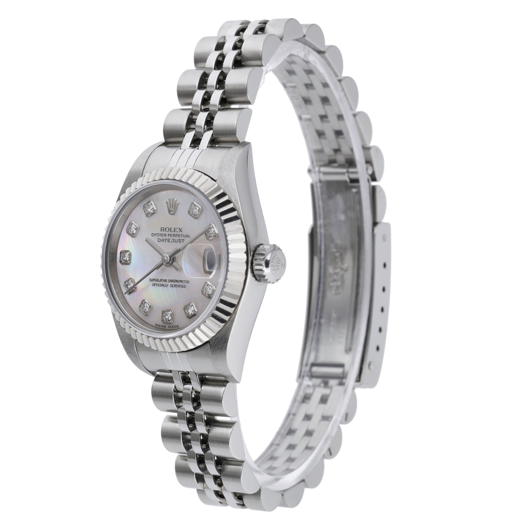 A Rolex Datejust reference 79174, presented in stainless steel with an 18ct white gold fluted bezel and an elegant mother-of-pearl dial set with diamond hour markers. This 2004 example is offered in immaculate condition and showcases one of the most refined and luxurious configurations within the classic Datejust collection. The natural mother-of-pearl dial displays subtle iridescent tones that shift beautifully in the light. At the same time, the diamond numerals add a sophisticated sparkle that complements the crisp white gold bezel. The 26mm Oyster case delivers a delicate and timeless profile on the wrist.