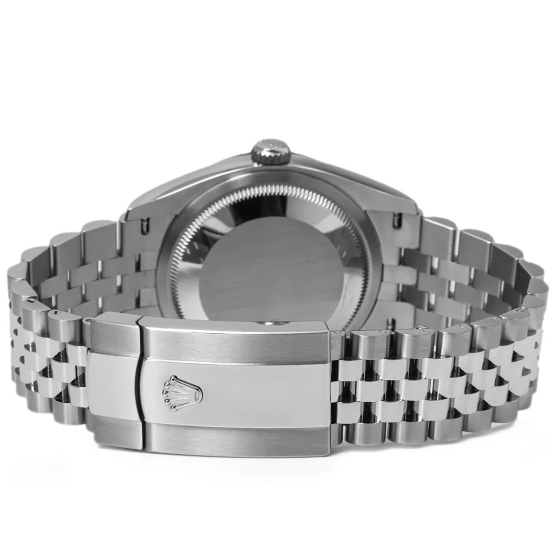 The 36mm Oyster case provides balanced proportions for everyday wear, complemented by baton hour markers filled with Chromalight luminescence for exceptional legibility. The date display at 3 o’clock — enhanced by the Cyclops magnifier — adds the signature functionality that defines the Datejust line.