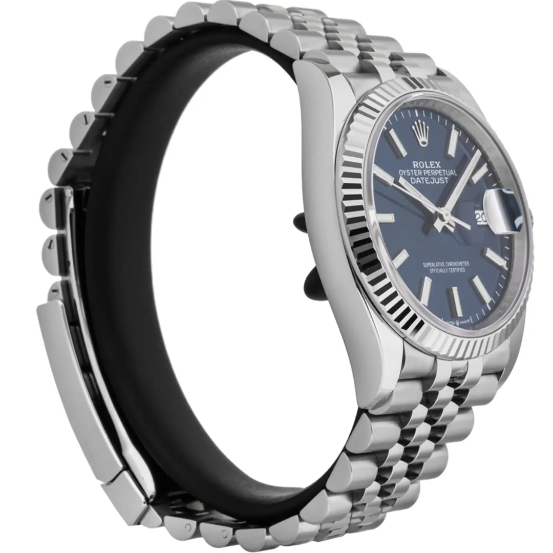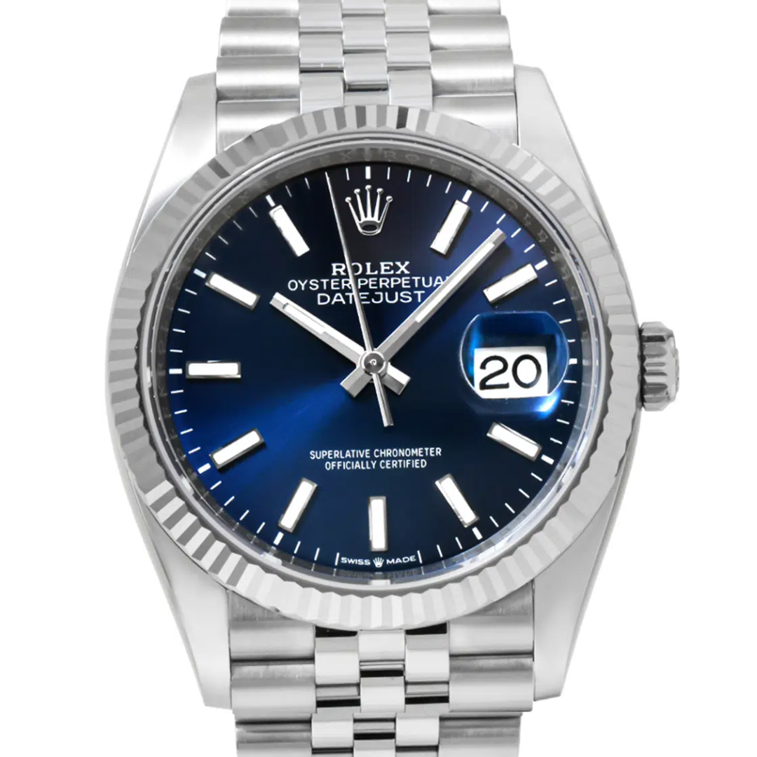 This 2024 Rolex Datejust 126234 combines timeless design with modern luxury, featuring a radiant sunburst blue dial that shimmers beautifully in changing light. The combination of Oystersteel, an 18ct white gold fluted bezel, and the elegant five-link Jubilee bracelet delivers a refined and unmistakably Rolex aesthetic.