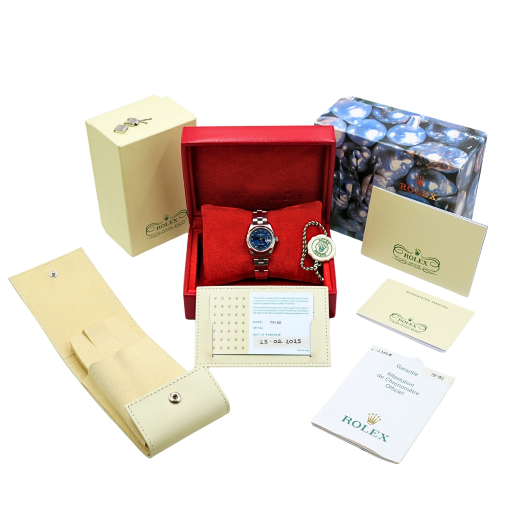 A Rolex Datejust 26, model 79160, is not just a fine example of Rolex craftsmanship — it’s a Rolex Certified Pre-Owned timepiece, an exclusive programme reserved for only the finest examples in the world. Presented in immaculate condition since 2004, this model comes with the official Rolex Certified Pre-Owned cream authentication set, which includes the sought-after cream wallet, guarantee card, and green seal. This seal signifies that the watch has been thoroughly inspected, tested, and officially authenticated by Rolex. This certification is one of the most prestigious recognitions available for any pre-owned Rolex, confirming its authenticity and integrity to factory standards.