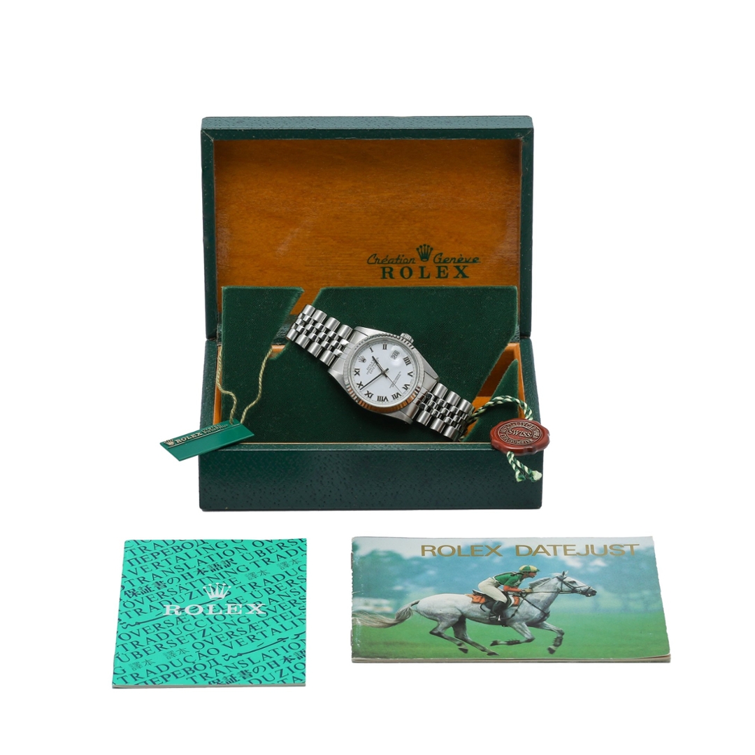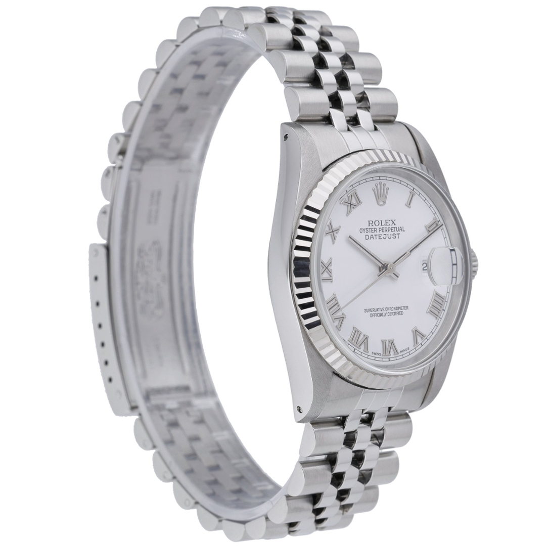 A Rolex Datejust 36, model 16234, perfectly embodies the enduring sophistication and craftsmanship synonymous with the Rolex name. Crafted from stainless steel and finished with an 18ct white gold fluted bezel, this elegant timepiece captures the timeless appeal of the classic Datejust design. The crisp white dial, detailed with bold black Roman numeral hour markers, creates a striking contrast that enhances both legibility and style.