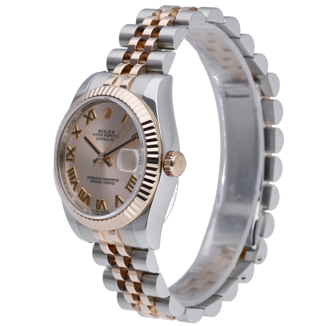 A Bi-Metal Rolex Datejust, model 178271, beautifully exemplifies refined luxury and timeless design. Crafted from stainless steel and 18ct rose gold, this elegant 31mm timepiece features the signature fluted bezel that reflects light with a subtle brilliance, perfectly complementing the soft pink dial. The dial is adorned with bold Roman numeral hour markers and a magnified date display at three o’clock, striking a balance between sophistication and everyday wearability.