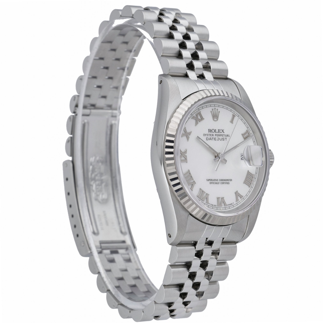 A Rolex Datejust 36, model 16234, perfectly embodies the enduring sophistication and craftsmanship synonymous with the Rolex name. Crafted from stainless steel and finished with an 18ct white gold fluted bezel, this elegant timepiece captures the timeless appeal of the classic Datejust design. The crisp white dial, detailed with bold black Roman numeral hour markers, creates a striking contrast that enhances both legibility and style.