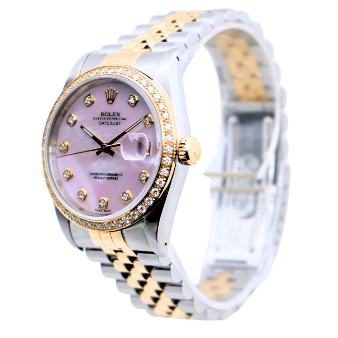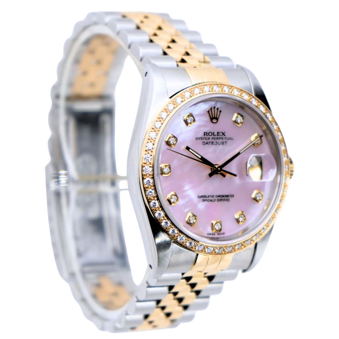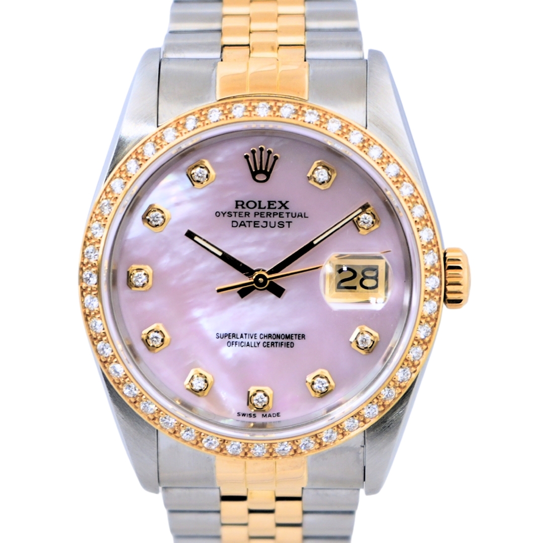 A Bi-Metal Rolex Datejust Watch, Stainless Steel & 18ct Yellow Gold with an Afterset Diamond Bezel on an Afterset Pink Mother of Pearl Dial with Diamond Numerals (Accompanied by the Original Bezel & Dial)
