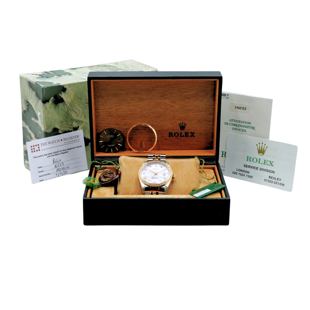 A Rolex Datejust 16233 is a stunning example of classic design elevated with luxurious modern enhancements. This bi-metal timepiece, crafted from robust stainless steel and 18ct yellow gold, measures 36mm in diameter—a timeless and versatile size that suits any wrist. Initially produced in 1989, this watch has been immaculately maintained and comes complete with service paperwork, a Watch Register certificate, and a full presentation box.