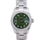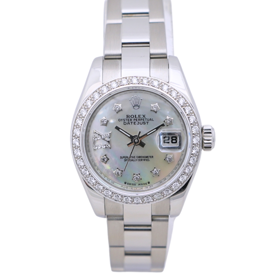 A Rolex Datejust Watch that exudes refined sophistication and timeless charm. Crafted from stainless steel, this elegant model features an exquisite afterset white mother-of-pearl dial adorned with diamond hour markers, including the signature diamond-set Roman numeral VI for added brilliance. The afterset diamond bezel enhances the watch’s elegance, giving it a radiant sparkle that perfectly complements the natural shimmer of the mother-of-pearl dial. Supplied with its original Rolex bezel and dial, this piece offers collectors flexibility and authenticity.