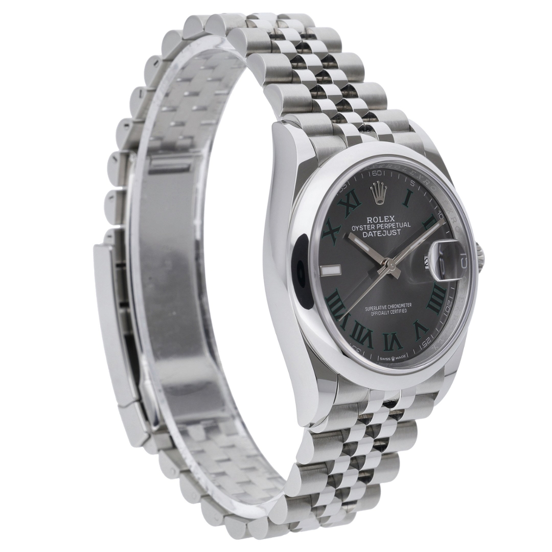 A Rolex Datejust 36, model 126200, is a timeless representation of refined craftsmanship and precision engineering. Crafted entirely from stainless steel, this 36mm model exudes understated elegance and versatility. The striking slate dial, featuring the iconic green-outlined Roman numerals known as the “Wimbledon” design, adds a distinctive contemporary flair while maintaining classic Rolex sophistication. The date aperture at three o’clock, complete with the signature Cyclops lens, ensures perfect readability and balance across the dial.