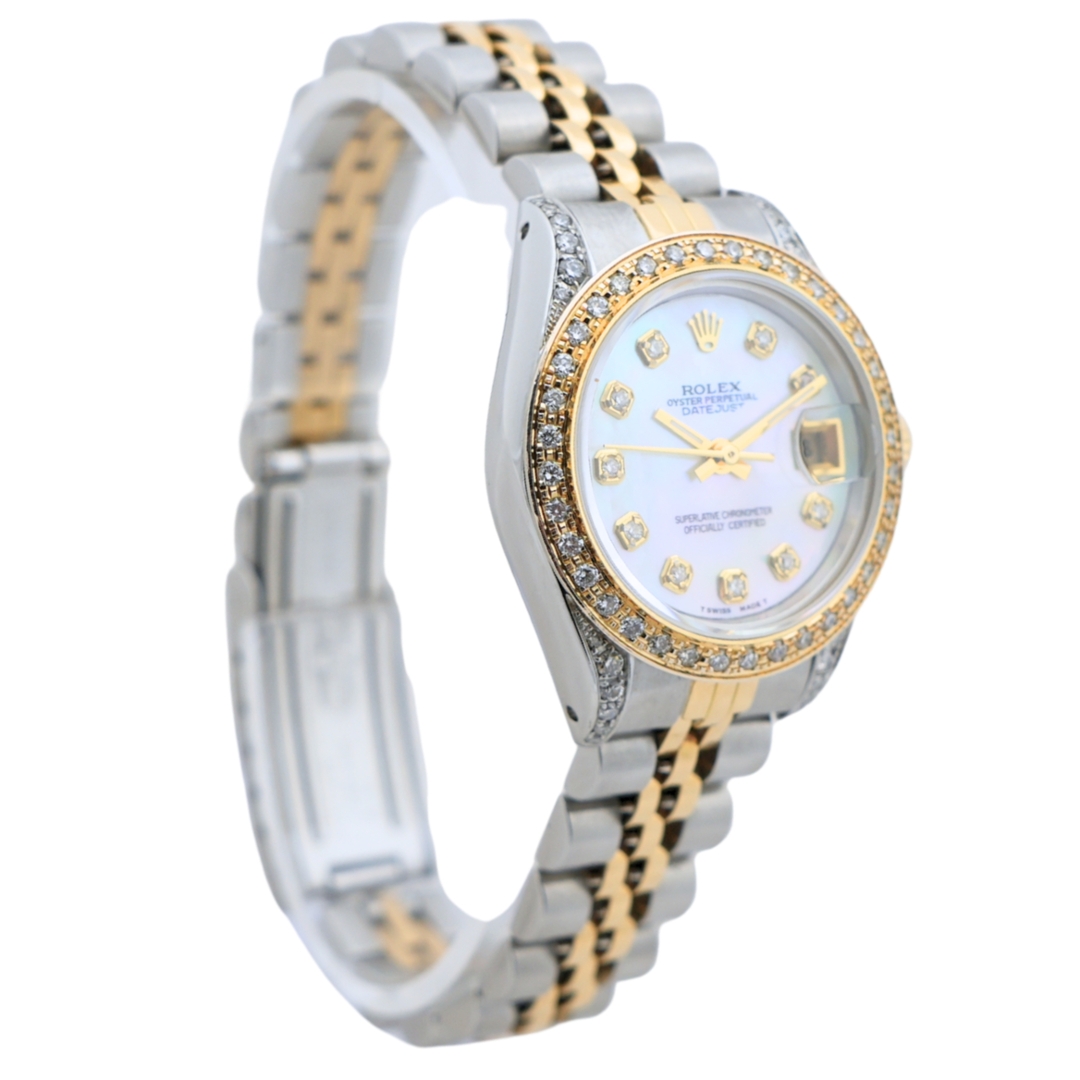 A Bi-Metal Rolex Datejust, reference 69173, showcases a perfect harmony of luxury and craftsmanship in a timeless design. Crafted from stainless steel and 18ct yellow gold, this elegant 26mm model is enhanced with an exquisite afterset diamond bezel and diamond-set shoulders, creating a captivating brilliance from every angle. It's stunning after-market mother-of-pearl dial adds iridescent depth and charm, beautifully complemented by diamond hour markers set in yellow gold for an unmistakably luxurious finish.