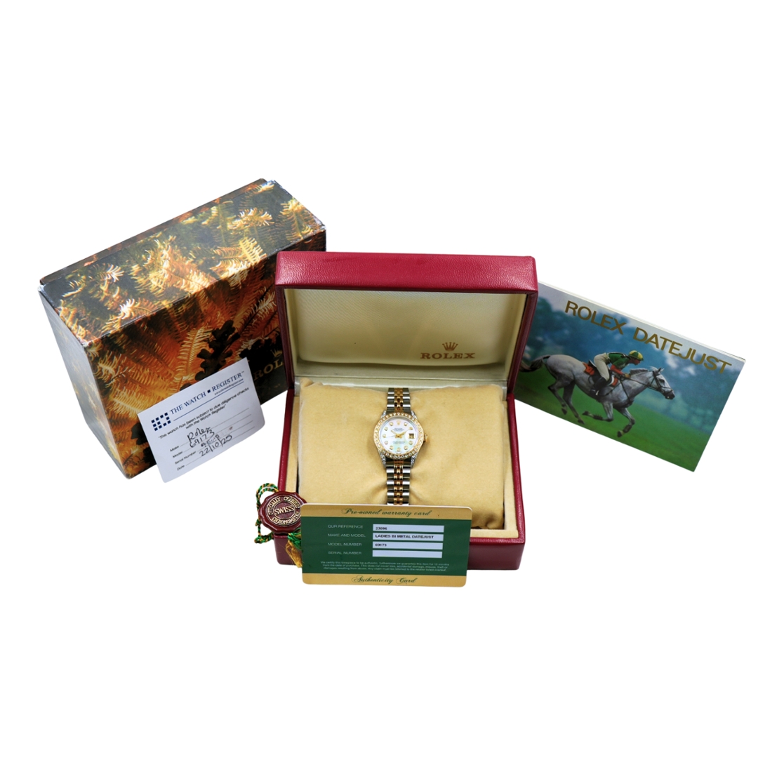 Dating from 1986, this example is presented in immaculate condition and is complete with its Rolex box, authenticity paperwork, Watch Register Certificate, and full certification. It also includes a 12-month WLC warranty, providing assurance and confidence to its next owner. The Rolex Datejust 69173 with afterset diamond features and a mother-of-pearl dial is a striking reinterpretation of a classic — a true statement piece that radiates sophistication and individuality.