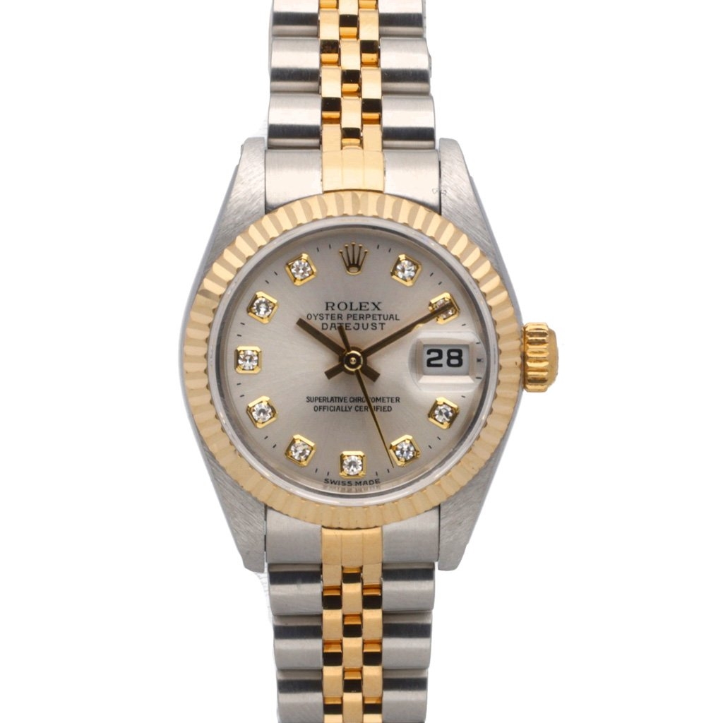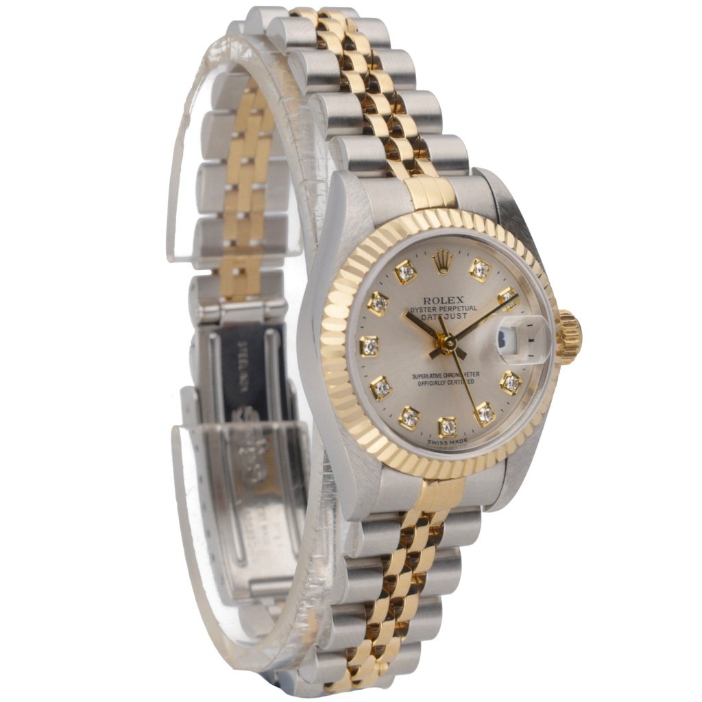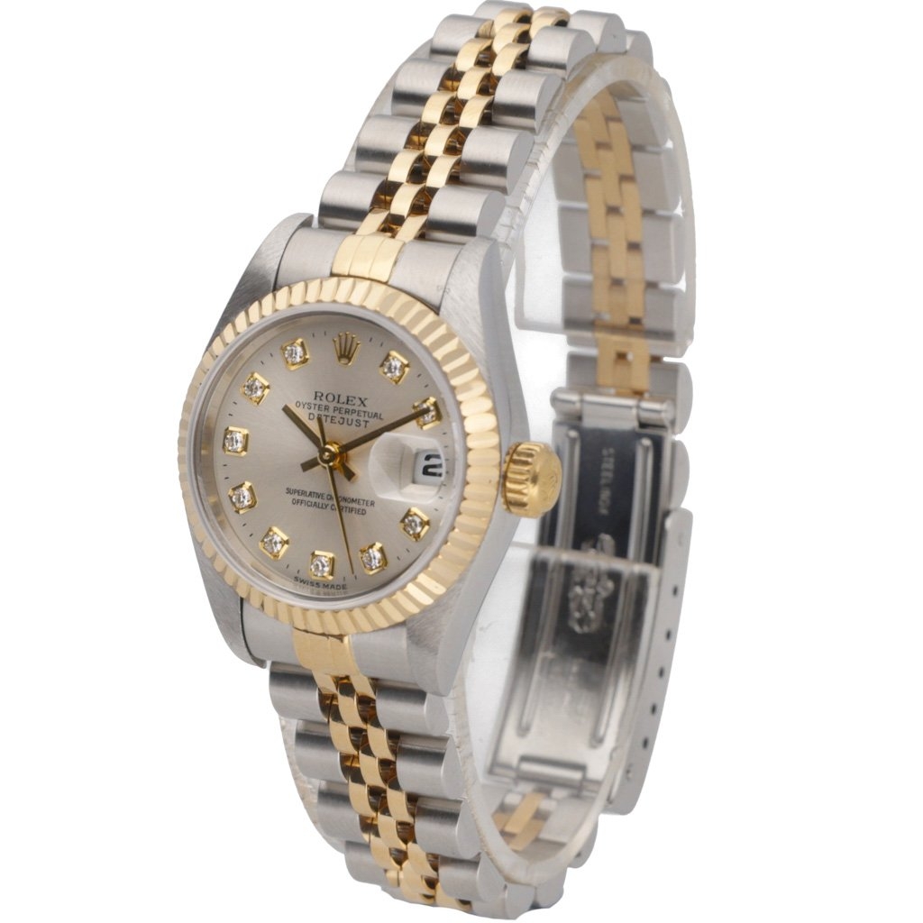 A Bi-Metal Rolex Datejust, reference 69173, beautifully blends classic design with timeless luxury. Crafted from stainless steel and 18ct yellow gold, this elegant 26mm model showcases Rolex’s signature craftsmanship and enduring appeal. The silver dial, adorned with original Rolex diamond-set hour markers, brings a refined brilliance to the design, perfectly complemented by the gold fluted bezel and matching Jubilee bracelet — an unmistakable hallmark of Rolex sophistication.