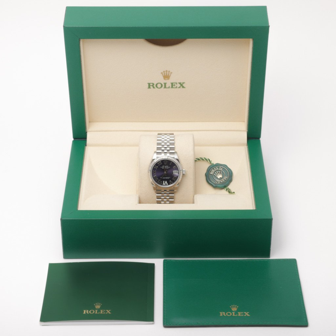 Dated from 2017, this example is presented in immaculate condition and comes complete with its original Rolex box, paperwork, and certification. It is further backed by a 12-month WLC warranty, ensuring complete peace of mind. The Rolex Datejust 178274 with its distinctive purple dial and diamond-set Roman six offers a refined blend of classic design and modern elegance — a truly captivating timepiece that radiates prestige and timeless appeal.