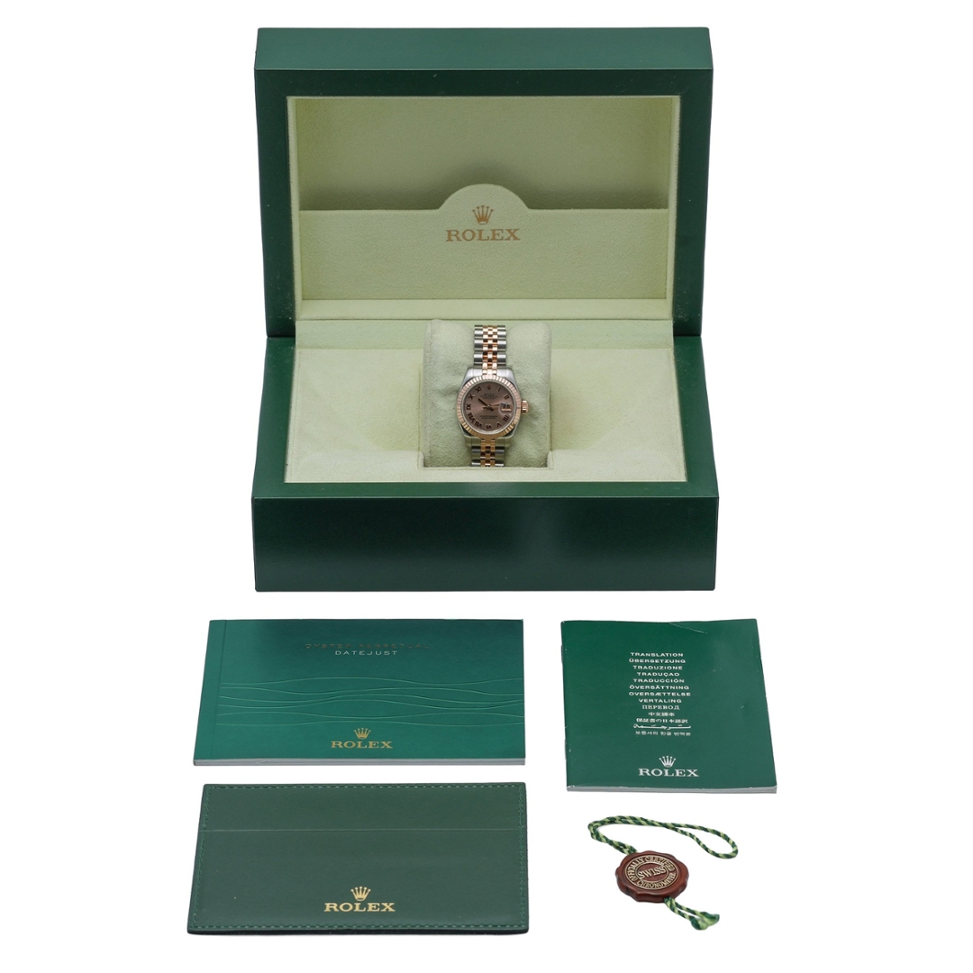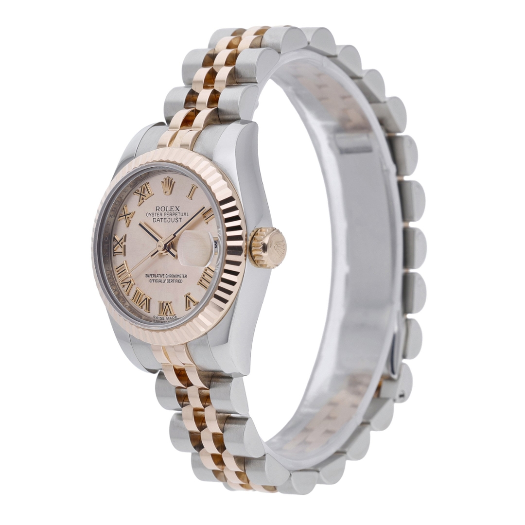 A bi-metal Rolex Datejust 26, combining stainless steel with warm 18ct rose gold for a look that feels effortlessly elegant and unmistakably luxurious. This reference 179171 features a charming pink dial enriched with rose-gold Roman numeral hour markers, creating a soft yet striking aesthetic that has become one of the most sought-after configurations in the ladies’ Datejust range.