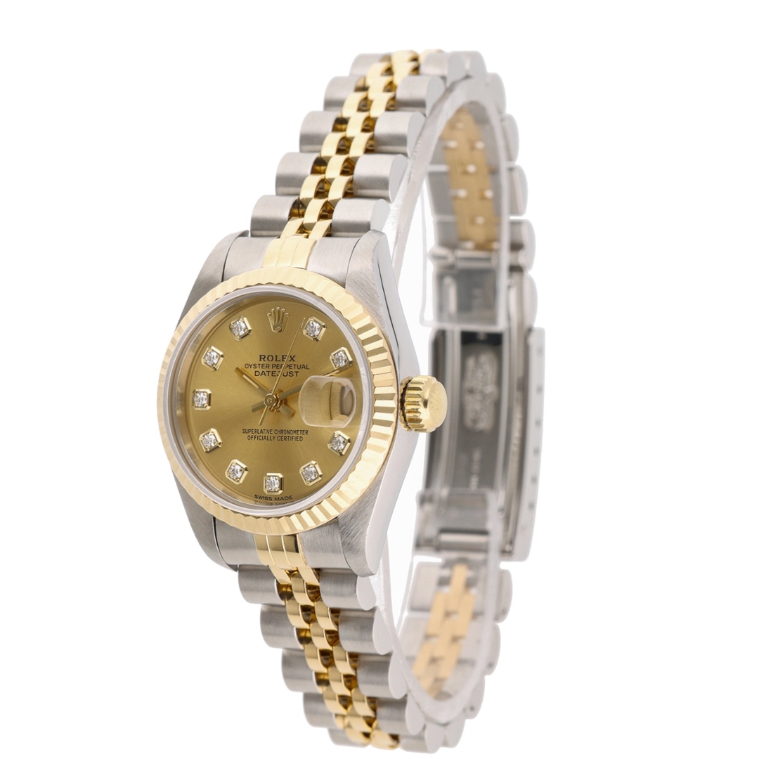 A Rolex Datejust 69173 is a stunning blend of luxury and timeless design, offering an elegant, refined aesthetic. This 1999 model, crafted from stainless steel and 18ct yellow gold, features a beautiful champagne dial enhanced by the original Rolex diamond numerals. These sparkling accents add an extra layer of sophistication, making it a standout piece. Its 26mm case size offers a delicate and graceful fit, perfect for those who appreciate smaller, more refined watches.