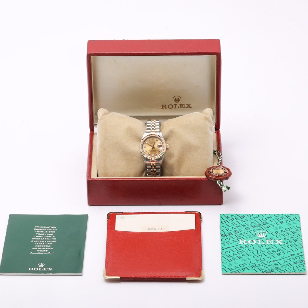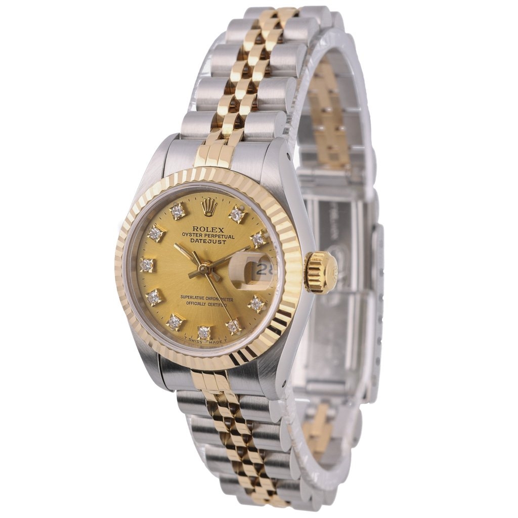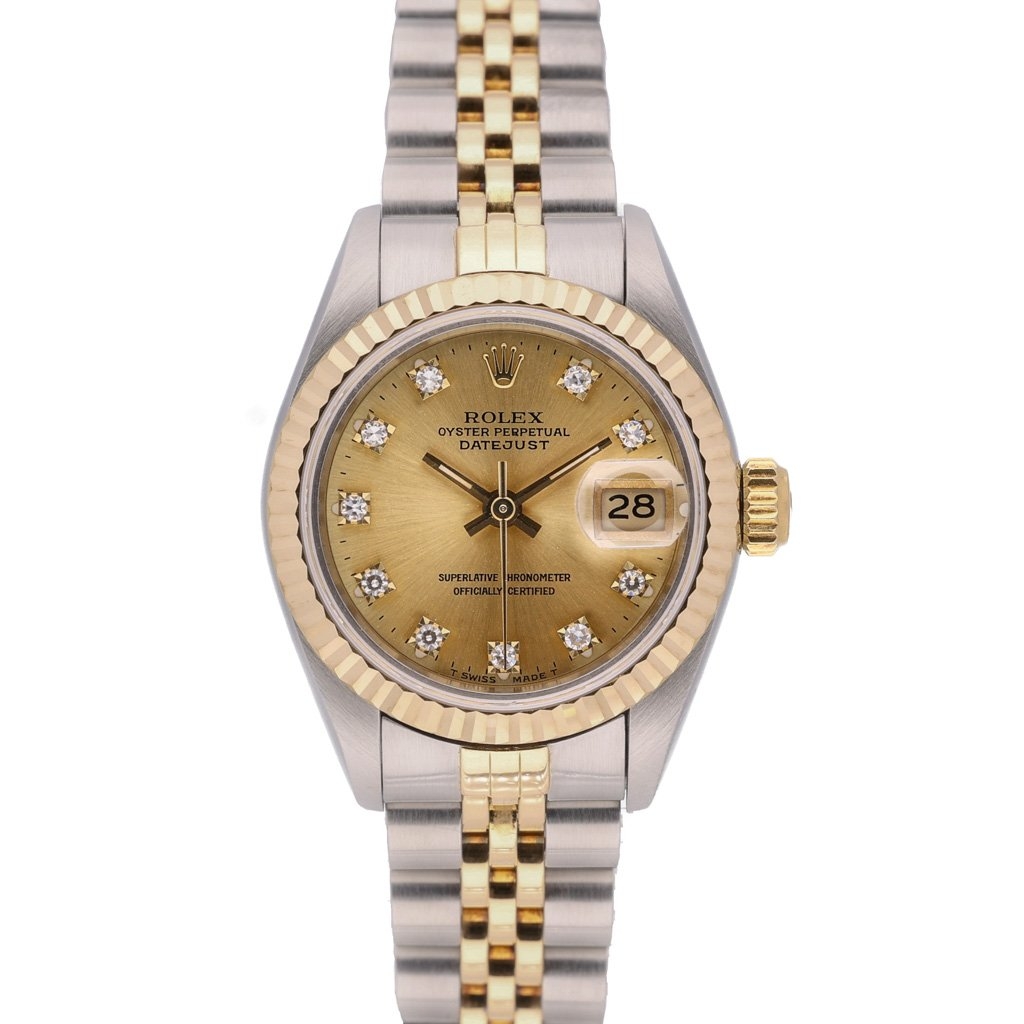 A Rolex Datejust 69173 is a stunning blend of luxury and timeless design, offering an elegant, refined aesthetic. This 1996 model, crafted from stainless steel and 18ct yellow gold, features a beautiful champagne dial enhanced by the original Rolex diamond numerals. These sparkling accents add an extra layer of sophistication, making it a standout piece. Its 26mm case size offers a delicate and graceful fit, perfect for those who appreciate smaller, more refined watches.