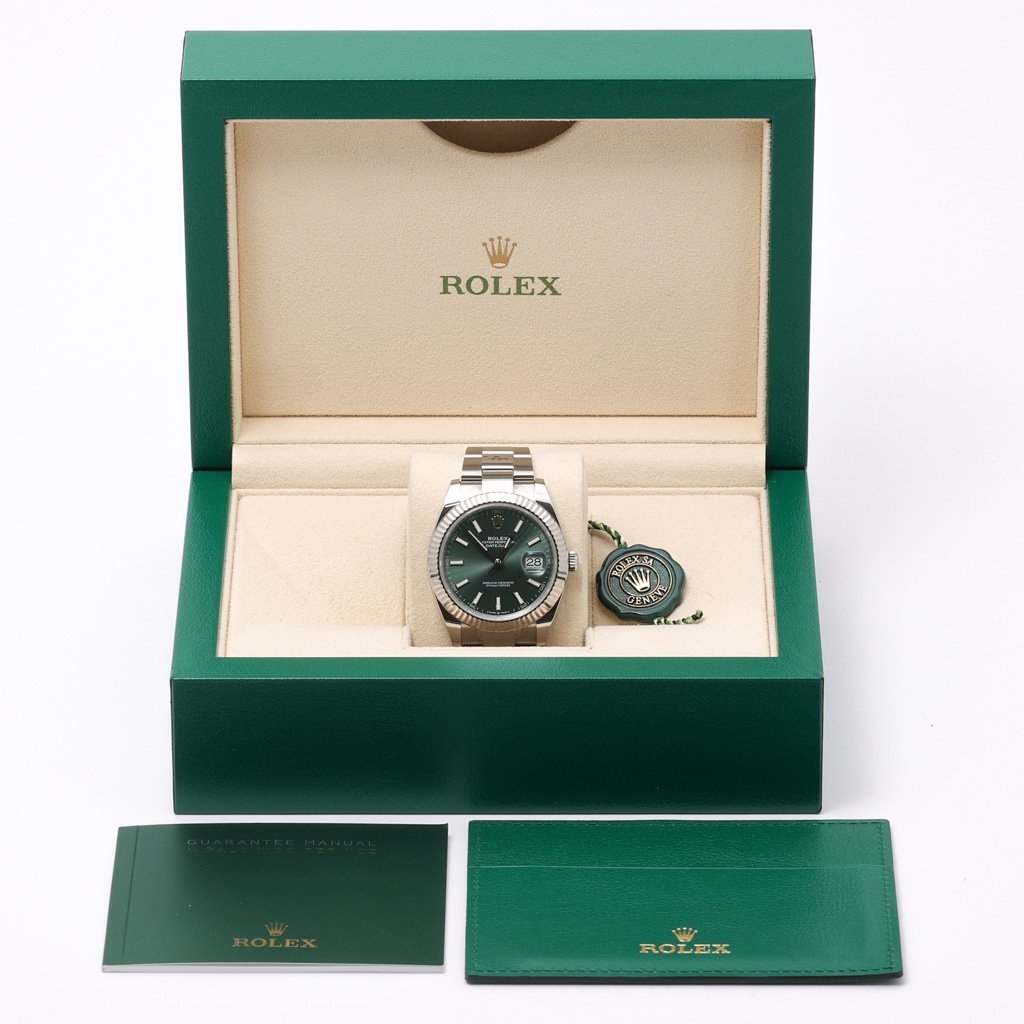 In immaculate condition, this example comes complete with its original Rolex box, full set of paperwork, and manufacturer's warranty valid until 2029. The dial configuration remains one of the most in-demand within the contemporary Datejust collection, admired for its rarity and strong resale performance.