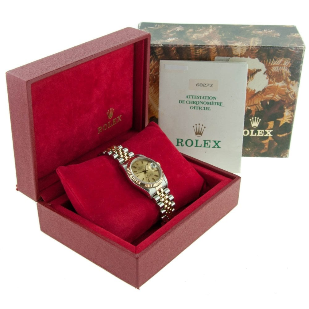 A bi-metal Rolex Datejust 31 offering timeless refinement, this reference 68273 pairs stainless steel with 18ct yellow gold for a classic two-tone finish. The champagne dial complements the fluted yellow-gold bezel perfectly, creating that unmistakable Datejust warmth collectors love. The clean baton hour markers and matching gold hands give this 1993 example an elegant, understated presence, while the 31mm case size makes it a versatile choice for both daily wear and more formal occasions.