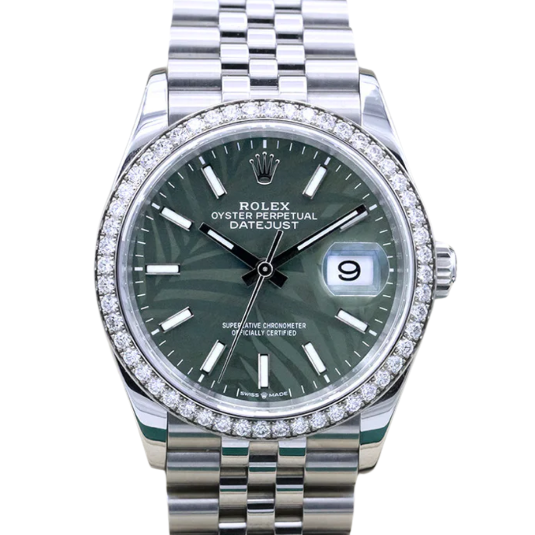 A Rolex Datejust Watch, Stainless Steel with an 18ct White Gold Diamond Bezel and a Green Palm Dial.